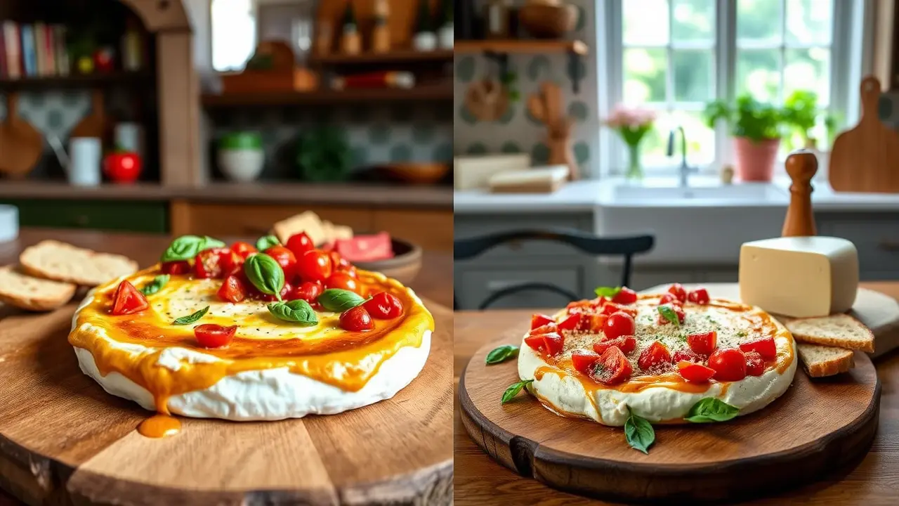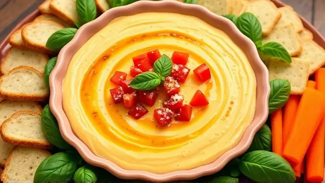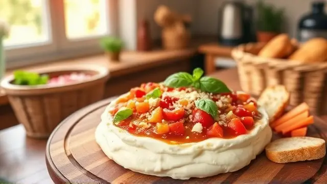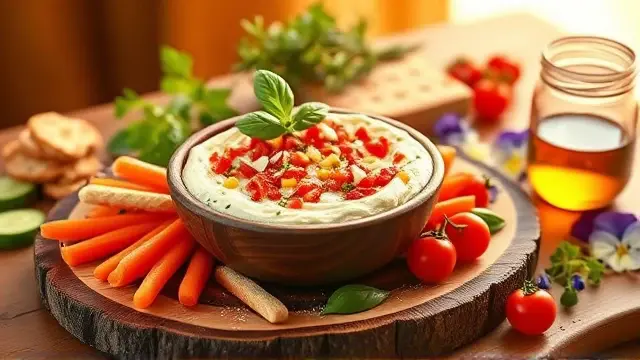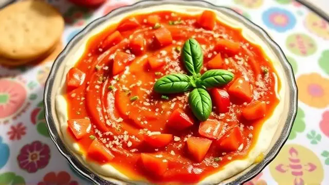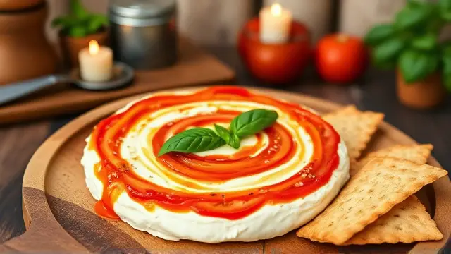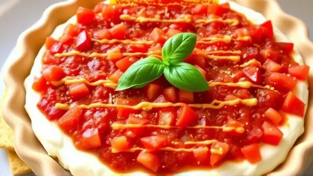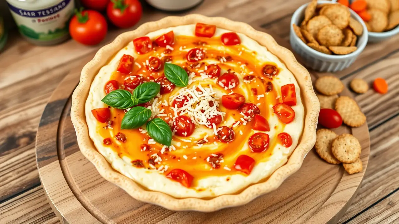 **Fresh Tomato Basil Dip** ========================= This delicious dip is perfect for a quick snack or party appetizer. The combination of creamy cream cheese, sweet plum tomatoes, tangy Italian dressing, and fragrant fresh basil creates a flavorful and refreshing treat that's sure to please. ### Ingredients * 8 ounces cream cheese (softened) * 2 plum tomatoes (chopped) * 2 tablespoons zesty Italian dressing * 1 tablespoon finely chopped fresh basil * Parmesan cheese (sprinkle to taste) ### Directions Spread the softened cream cheese onto the bottom of a 9-inch pie plate. Mix together the chopped tomatoes and zesty Italian dressing, then spoon this mixture over the cream cheese. Sprinkle with Parmesan cheese and top with chopped fresh basil. Serve with wheat thins, snack crackers, or assorted cut-up fresh vegetables for a delightful snack or party appetizer. This recipe makes approximately 1 3/4 cups or 14 servings. ### Suggested Variations * Add some diced garlic to the tomato mixture for an extra depth of flavor * Use cherry tomatoes instead of plum tomatoes for a different texture and flavor * Substitute chopped fresh parsley for the basil if you prefer a milder herb flavorname