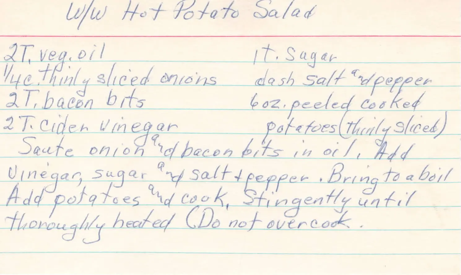 Hot potato salad. Two tablespoons of vegetable oil. Quarter cup of thinly sliced onions. Two tablespoons of bacon bits. Two tablespoons of cider vinegar. One teaspoon of sugar. Dash of salt and pepper. Six ounces of peeled and cooked potatoes also thinly sliced. Ingredients. Oh, sorry. Instructions. Saute onion and bacon bits in oil. Add vinegar, sugar, salt and pepper. Bring to a boil. Add potatoes and cook. Stringently until thoroughly heated. Do not overcook.llm