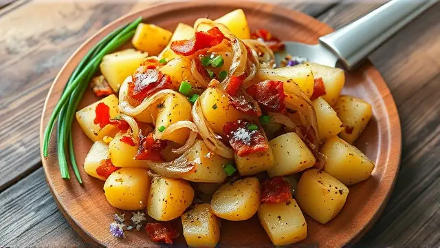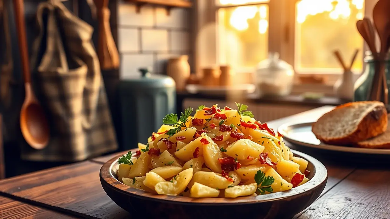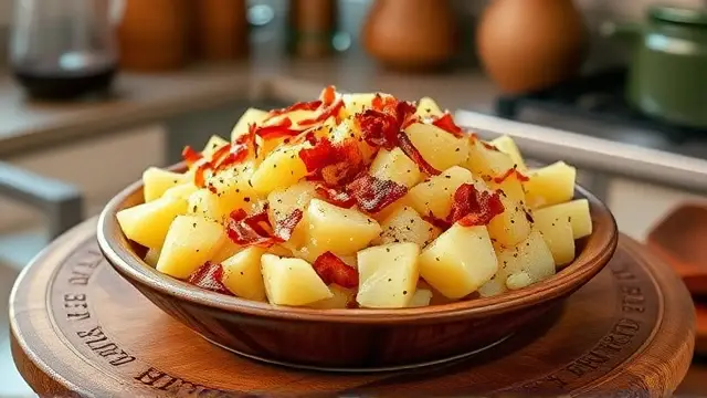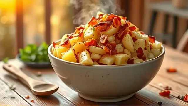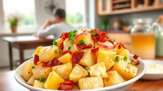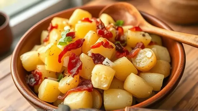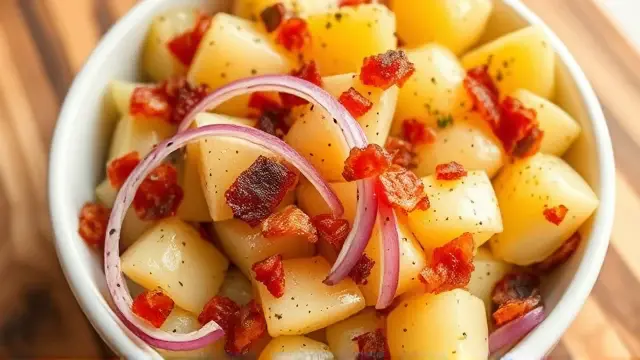 # Warming Hot Potato Salad 🥔✨ This comforting hot potato salad is a delightful twist on a classic dish, making it the perfect side for any meal—from summer barbecues to cozy winter dinners. You'll love the combination of crispy bacon and tender potatoes, all dressed up in a sweet and tangy vinaigrette. Serve it warm for the best experience, and don’t be surprised if it disappears in no time! ## Ingredients ### For the salad - 2 tablespoons vegetable oil - 1/4 cup thinly sliced onions - 2 tablespoons bacon bits (feel free to use crispy cooked bacon for extra flavor) - 2 tablespoons cider vinegar - 1 tablespoon sugar - Dash of salt & pepper - 6 ounces peeled cooked potatoes (thinly sliced) ## Instructions 1. Heat the vegetable oil in a skillet over medium heat. 2. Sauté the sliced onions and bacon bits until the onions are tender and fragrant. This should take about 3-4 minutes. > 🔥 Cooking the onions slightly longer will enhance their sweetness and flavor—just be careful not to let them brown too much! 3. Add the cider vinegar, sugar, and a dash of salt and pepper. Bring the mixture to a boil. 4. Gently stir in the thinly sliced cooked potatoes. Cook, stirring gently, until the potatoes are thoroughly heated. > 🥄 Be cautious not to overcook the potatoes, as they can become mushy. Aim for just enough time to warm them through! ## Serving Suggestions - Pair this hot potato salad with grilled meats or roasted chicken for a hearty meal. - It’s also delicious the next day! Just reheat it gently in the microwave or on the stove. ## Variations - **Herb Lover**: Add chopped fresh herbs like parsley or chives at the end for a burst of freshness. 🌿 - **Spicy Kick**: Add a pinch of red pepper flakes to the onion and bacon mixture for a bit of heat. 🌶️ - **Healthy Twist**: Substitute some of the potatoes with steamed green beans or peas for extra color and nutrition. - **Vegan Option**: Use olive oil instead of vegetable oil, and skip the bacon bits for a lighter dish—add smoked paprika for a touch of smokiness! Enjoy this warm and flavorful potato salad at your next gathering—it’s sure to be a crowd-pleaser! 🎉🥗name