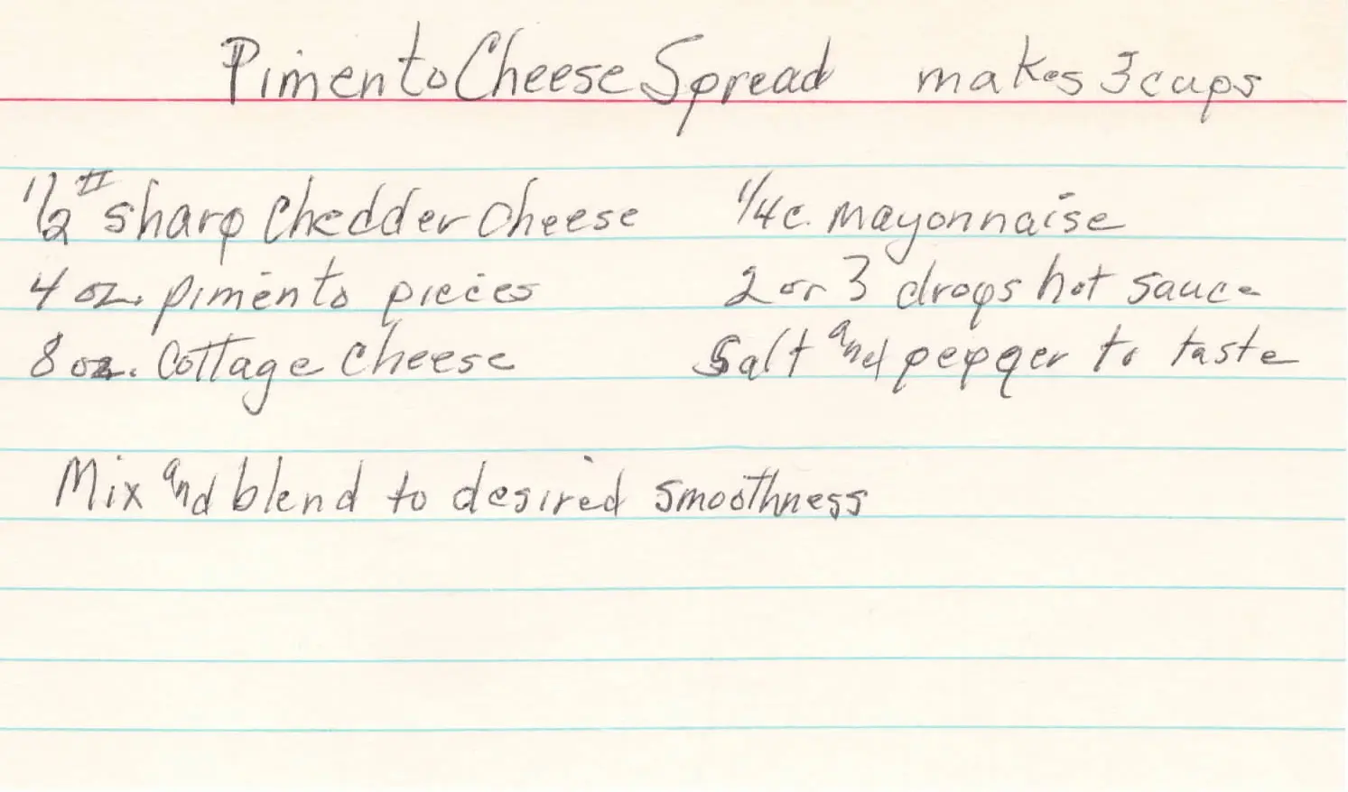 Pimento cheese spread makes three cups. Half pound sharp cheddar cheese, four ounces of pimento pieces, eight ounces of cottage cheese, one quarter cup mayonnaise, two or three drops of hot sauce, salt and pepper to taste. Mix and blend to desired smoothness.llm