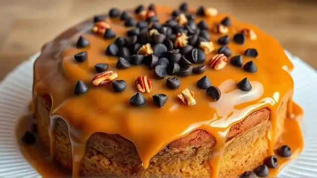 - Remove the cake from the oven and let it cool for a few minutes. Drizzle the caramel mixture over the top of the cake.