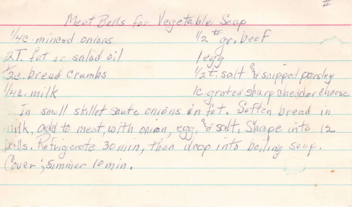 Meatballs for vegetable soup 1/4 cup minced onions 2 tablespoons of fat or salad oil 1/2 cup bread crumbs 1/4 cup milk 1/2 pound ground beef 1 egg 1/2 teaspoon salt and snipped parsley 1 cup grated sharp cheddar cheese In small skillet, saute onions in fat, soften bread in milk Meat with onion, egg, and salt Shape into 12 balls Refrigerate for 30 minutes, then drop into boiling soup Cover and simmer for 10 minutesllm