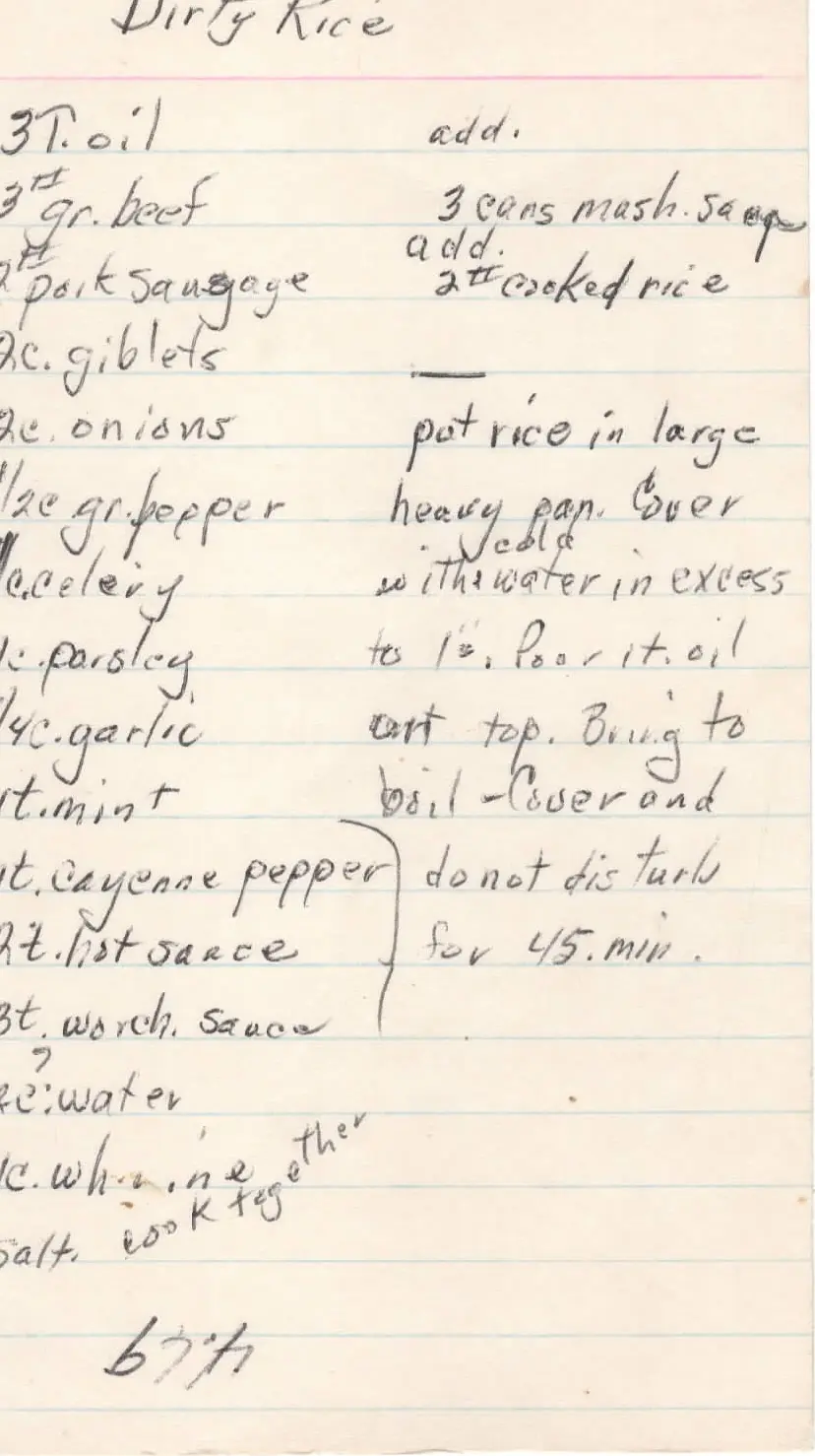 Dirty rice. 1 cup of white wine. Salt. Cook together. Then add 3 cups of mushroom soup. Then add 2 cups of cooked rice. Put rice in large heavy pan. Cover with cold water in excess water. to 1 inch. Pour in oil over top. Bring to boil. Cover and do not disturb for 45 minutes.llm