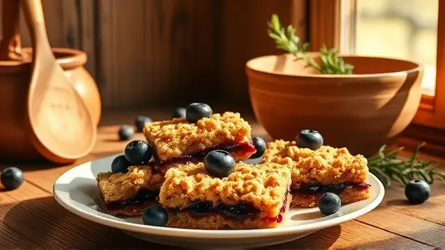 **Blueberry Bar Cookies** ===================================== These delicious bar cookies are perfect for a quick dessert or snack. With a crunchy oat and butter crust, a sweet blueberry filling, and a crumbly topping, they're sure to be a hit with anyone who tries them. **Ingredients** --------------- * 1 package of blueberry muffin mix * 5 tablespoons of butter, softened * 1 cup quick cooking oats * 1/2 cup raspberry or blackberry jam or preserves * 1 and 1/3 cups sugar (yes, you read that right - one and a half DOZEN medium bar cookies will only require 1 and 1/3 CUPS of sugar!) * 1 cup fresh blueberries * 1/4 cup reserved crumb mixture (see below) **Directions** ------------- 1. Preheat oven to 375°F. 2. Wash the blueberries and set them to drain. 3. In a large bowl, combine the dry muffin mix, oats, and sugar. Cut in the butter until the mixture forms crumbs. 4. Reserve about one cup of this crumb mixture for later use. 5. Press the rest of the crumb mixture into the bottom of a greased 8-inch square pan. 6. Gently fold the drained blueberries into the jam or preserves, then spoon the mixture over the crust in the pan. 7. Spread the berry mixture evenly and top with the reserved crumb mixture. Pat it down to form an even layer. 8. Bake for 20-25 minutes, or until the edges are golden brown. **Suggested Variations** ------------------------- * Use different types of jam or preserves, such as apricot or peach, for a unique flavor twist. * Add some chopped nuts, like almonds or walnuts, to the crumb mixture for added texture and flavor. * If you prefer a crunchier topping, try baking the cookies for an additional 5-10 minutes. I hope you enjoy these delicious blueberry bar cookies!name