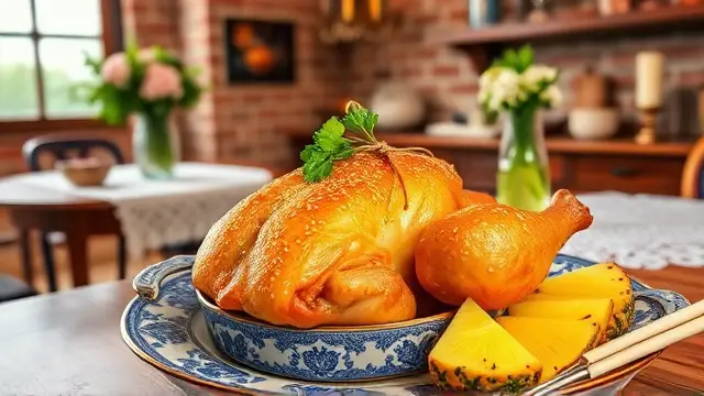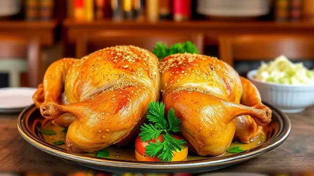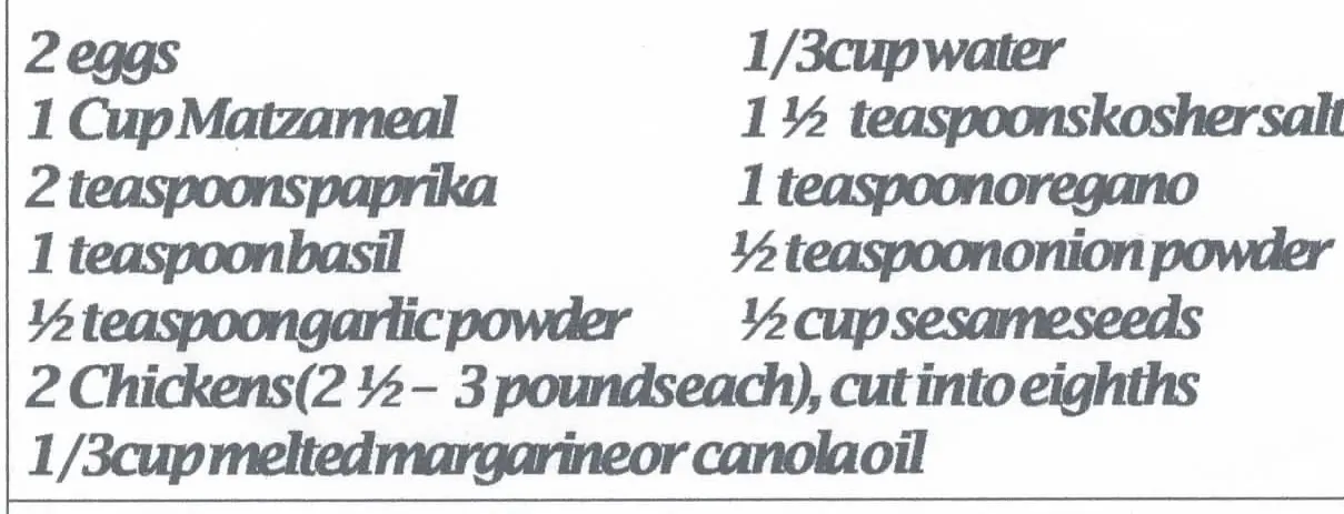Sesame seed chicken, two eggs, one cup of matzah meal, two teaspoons of paprika, one teaspoon of basil, half teaspoon garlic powder, two chickens of two and a half to three pounds each. Cut into eighths, one third of a cup of melted margarine or canola oil, one third of a cup of water, one and one half teaspoons of kosher salt, one teaspoon of oregano, one half teaspoon of onion powder, and one half cup of sesame seeds. Preheat oven to 350 degrees. Beat eggs with water. Combine matzah meal with salt, spices, and sesame seeds. Dip chicken pieces in egg mixture, then roll in matzah meal mixture. Place chicken in large baking dish with margarine or oil. Roast for about one and a half hours.llm