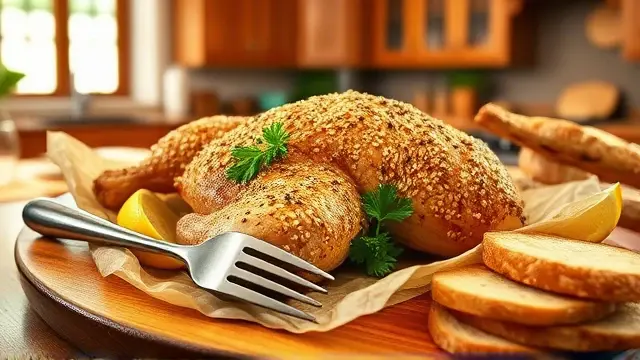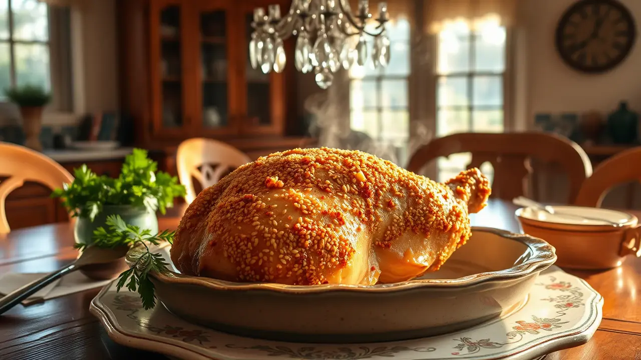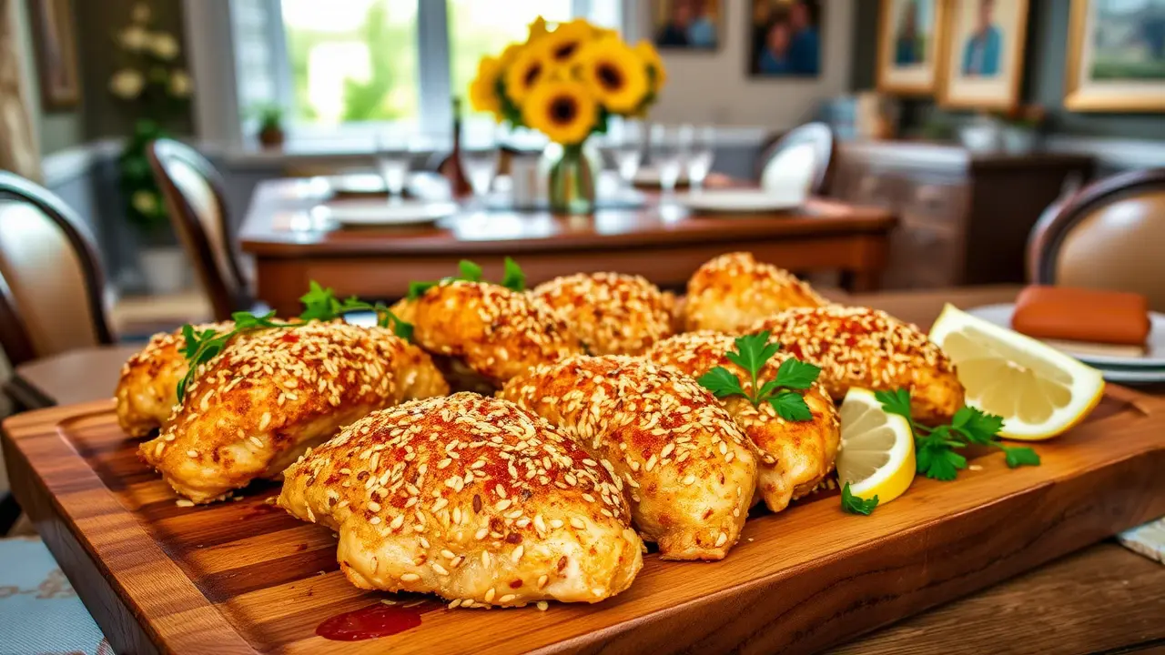 # Flavorful Sesame Seed Chicken 🍗✨ This savory Sesame Seed Chicken recipe is a delightful twist on a classic dish that will impress your family and friends! The crunchy sesame seeds provide a wonderful texture, while the blend of spices elevates the flavor to new heights. Perfect for special occasions or a comforting family dinner, serve it alongside a fresh salad or steamed vegetables for a complete meal! 🥗 ## Ingredients ### For the chicken - 2 chickens (2½ - 3 pounds each), cut into eighths - 2 eggs - 1/3 cup water - 1/3 cup melted margarine or canola oil ### For the seasoning - 1 cup matzo meal - 1½ teaspoons kosher salt - 2 teaspoons paprika - 1 teaspoon basil - ½ teaspoon garlic powder - ½ teaspoon onion powder - 1 teaspoon oregano - ½ cup sesame seeds ## Instructions 1. Preheat your oven to 375°F (190°C). 2. In a mixing bowl, whisk together the eggs and water to create an egg wash. > 🥄 This egg wash helps the breading adhere well to the chicken, so don’t skip this step! 3. In a separate bowl, mix the matzo meal, kosher salt, paprika, basil, garlic powder, onion powder, oregano, and sesame seeds. > 🌿 Feel free to add your own favorite spices for a unique flavor profile! 4. Dip each piece of chicken first into the egg wash, allowing any excess to drip off, then dredge it into the seasoning mixture, ensuring each piece is well-coated. 5. Place the coated chicken pieces in a single layer on a baking sheet lined with parchment paper. Drizzle the melted margarine or canola oil over the chicken for added richness. > 🍯 The oil helps create a crispy outer layer, giving you that perfect crunch! 6. Bake for 45-55 minutes or until the chicken is golden brown and cooked through (internal temperature should reach 165°F or 75°C). 7. Remove from the oven, let rest for a few minutes, and serve hot! ## Variations - **Spicy Kick**: Add a pinch of cayenne pepper or red pepper flakes to the breadcrumb mixture for some heat! 🔥 - **Herb-Infused**: Mix fresh or dried herbs like thyme or rosemary into your seasoning blend for a fragrant twist. - **Gluten-Free**: Substitute matzo meal with gluten-free breadcrumbs or almond flour. Just remember to adjust the seasoning as necessary. ### Tips > 🥡 Leftovers can be stored in the refrigerator for up to 3 days. Reheat in the oven for a crispy finish or enjoy cold in a salad!name