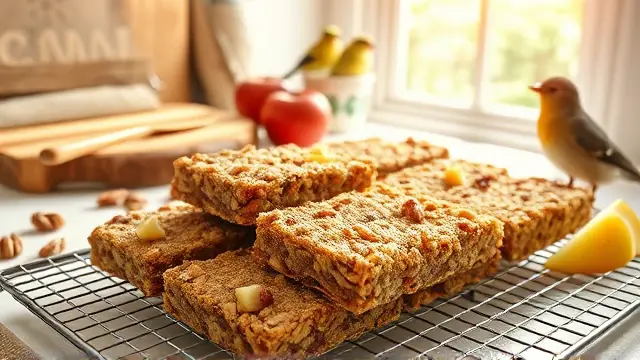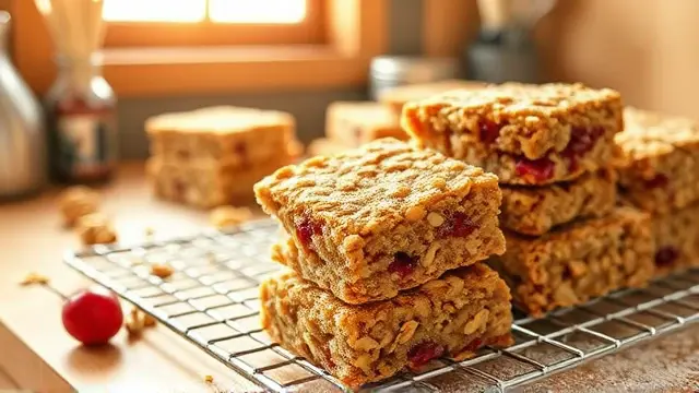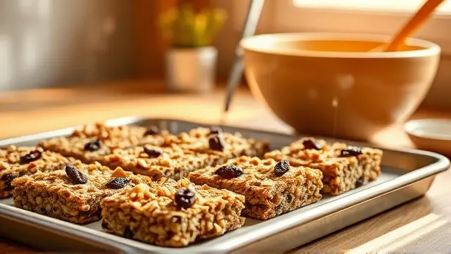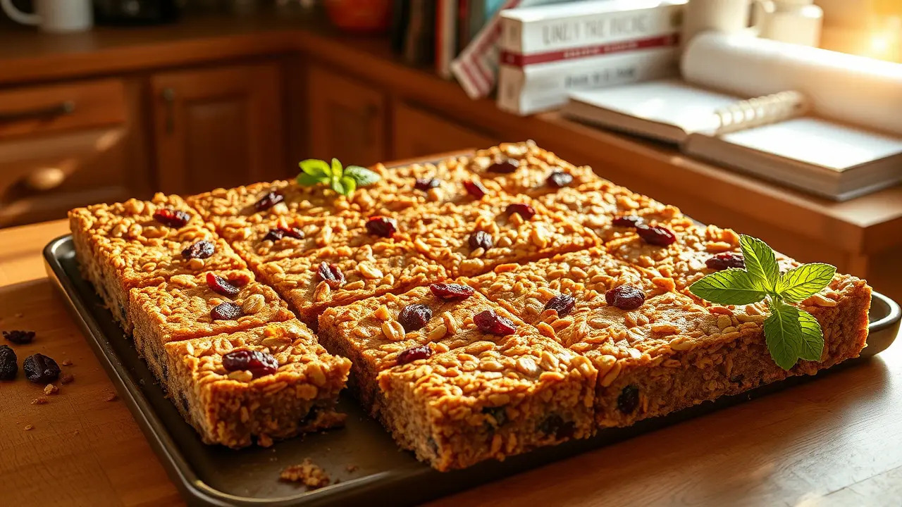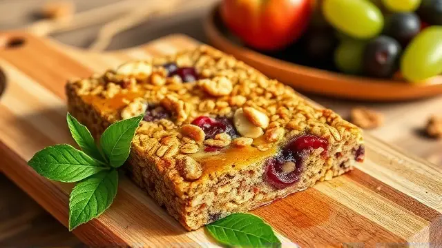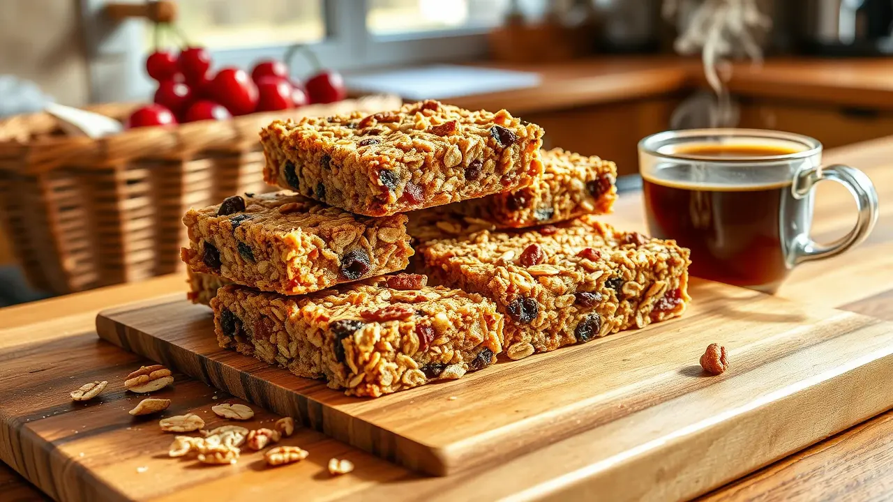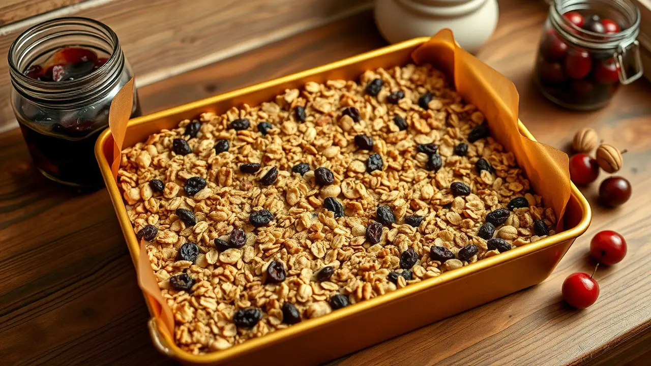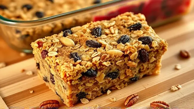 **Introducing Fruit and Nut Granola Bars** ============================================== These no-bake granola bars are a delicious and convenient snack that's perfect for on-the-go. With a mix of sweet and savory flavors, they're sure to be a hit with both kids and adults. **Ingredients** --------------- * 3 cups rolled oats * 1 cup chopped nuts (such as almonds or walnuts) * 1 cup raisins * 2/3 cup milk * 1/3 cup honey * 1 egg, beaten * 1/2 teaspoon vanilla extract * 1/2 cup brown sugar * 20 ounces cherry pie filling **Directions** ------------- 1. In a 15x10 pan, spread out the oats. 2. Toast in a 350-degree oven for 15 or 20 minutes. 3. In a large bowl, mix together the nuts and raisins. 4. Melt the margarine and honey, then stir in the beaten egg, vanilla extract, brown sugar, and cherry pie filling. 5. Stir the wet ingredients into the oat mixture. 6. Press the mixture firmly into the pan. 7. Bake at 350 degrees for 20 to 30 minutes. 8. Cool completely before cutting into squares. **Variations and Adjustments** ----------------------------- * To make these bars more crunchy, add some chopped seeds (such as sunflower or pumpkin) to the oat mixture. * For a different flavor, use a different type of pie filling, such as blueberry or strawberry. * If you prefer a chewier bar, bake for 15 minutes instead of 20-30.name
