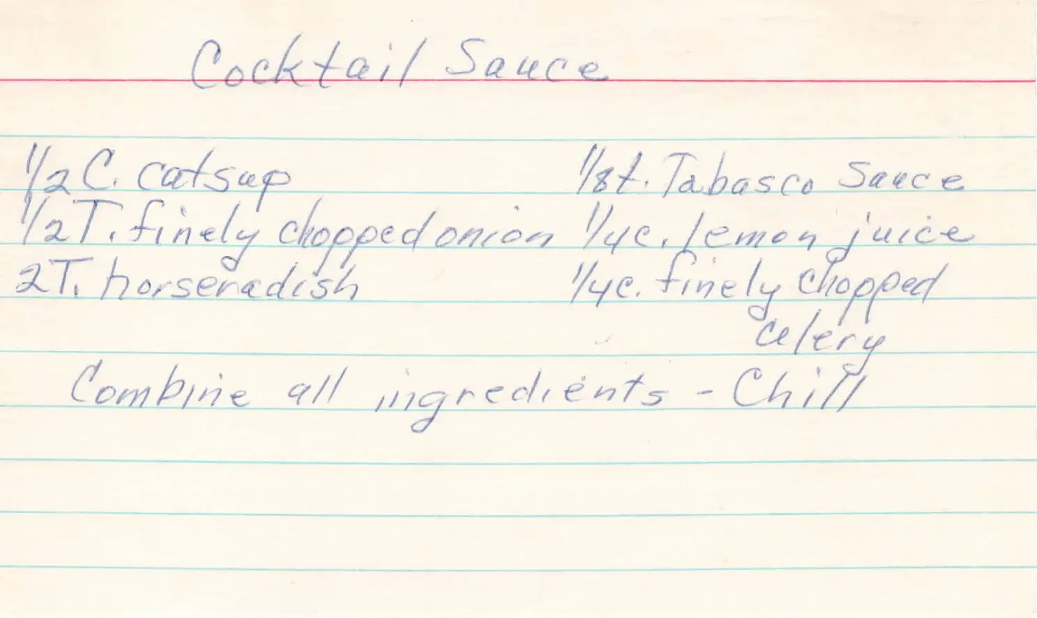 Cocktail sauce. One half cup ketchup. One half tablespoon finely chopped onion. Two tablespoons horseradish. One and one eighth teaspoon Tabasco sauce. One quarter cup lemon juice. One quarter cup finely chopped celery. Combine all ingredients and chill.llm