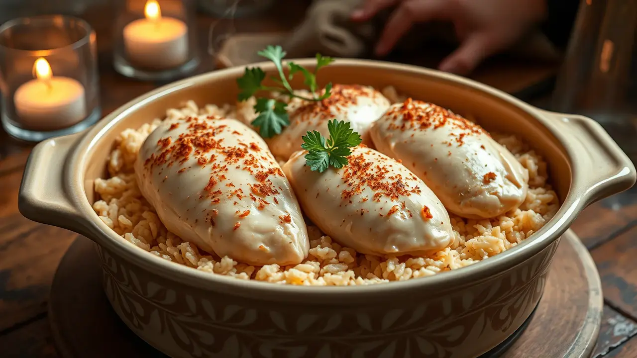 - Place the chicken on top of the rice mixture.