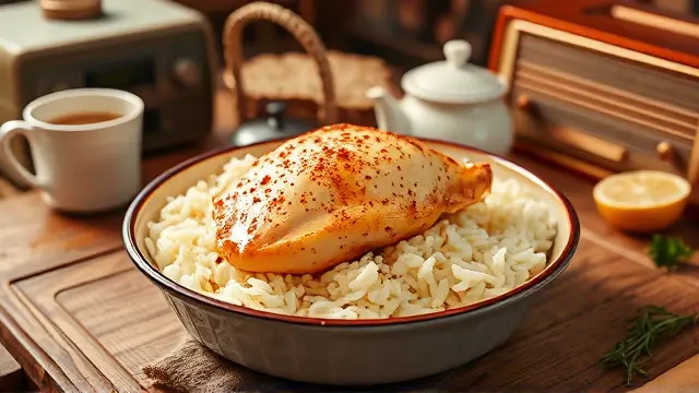 One dish chicken and rice bake. Preparation time, five minutes. Cook time, 45 minutes. Ingredients, one can of cream of mushroom soup, one cup of water, three quarters cup of uncooked regular white rice, one quarter teaspoon paprika, one quarter teaspoon pepper, four skinless boneless chicken breast halves. instructions. Step one, in a two quart shallow baking dish mix soup, water, rice, paprika, and pepper. Place chicken on rice mixture. Sprinkle with additional paprika and pepper. Step two, cover, bake at 375 degrees for 45 minutes or until done. Serves four. [BLANK_AUDIO]llm