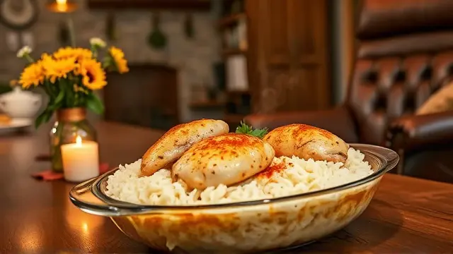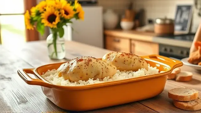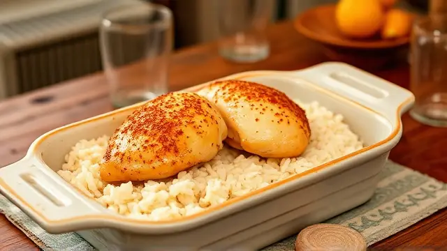 **One Dish Chicken and Rice Bake** ===================================== Are you looking for a simple, comforting meal that's ready in under an hour? Look no further than this One Dish Chicken and Rice Bake! With just a few ingredients and minimal prep time, you can have a delicious, home-cooked meal on the table in no time. **Ingredients** --------------- * 1 can of cream of mushroom soup * 1 cup of water * 3/4 cup of uncooked regular white rice * 1/4 teaspoon of paprika * 1/4 teaspoon of pepper * 4 skinless, boneless chicken breast halves **Directions** ------------- 1. In a 2-quart shallow baking dish, mix together the cream of mushroom soup, water, rice, paprika, and pepper. 2. Place the chicken on top of the rice mixture. 3. Sprinkle additional paprika and pepper over the chicken. 4. Cover the dish with aluminum foil and bake at 375°F for 45 minutes, or until the chicken is cooked through. **Serves:** 4 This recipe is a great example of how to make a satisfying meal with minimal effort. You can't go wrong with this one! **Variations:** * Add some frozen peas or carrots to the rice mixture for extra color and nutrients. * Use chicken thighs instead of breasts for more flavor and juiciness. * Mix in some diced onions, bell peppers, or mushrooms into the rice mixture for added flavor.name