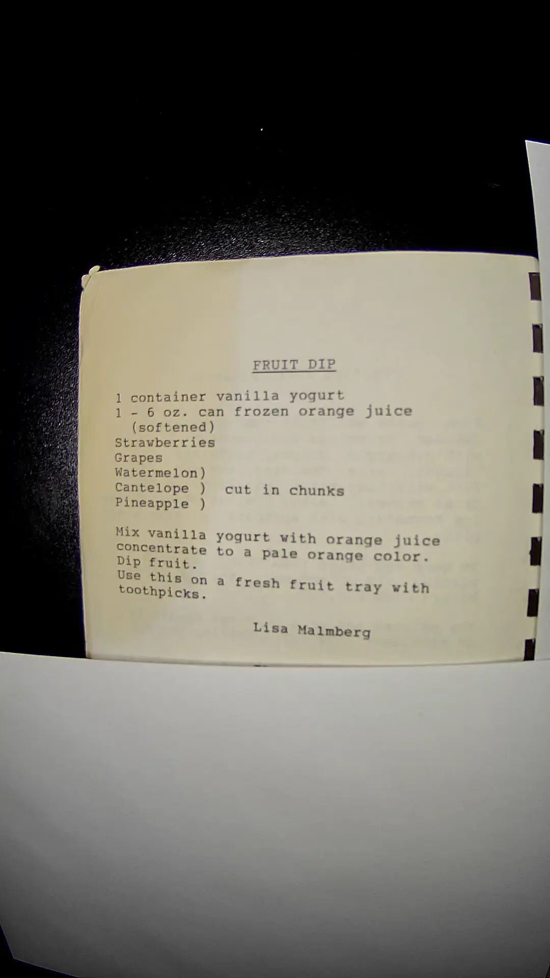 Here's the text from the image: ``` FRUIT DIP 1 container vanilla yogurt 1 - 6 oz. can frozen orange juice (softened) Strawberries Grapes Watermelon Cantelope ) cut in chunks Pineapple ) Mix vanilla yogurt with orange juice concentrate to a pale orange color. Dip fruit. Use this on a fresh fruit tray with toothpicks. Lisa Malmberg ```llm
