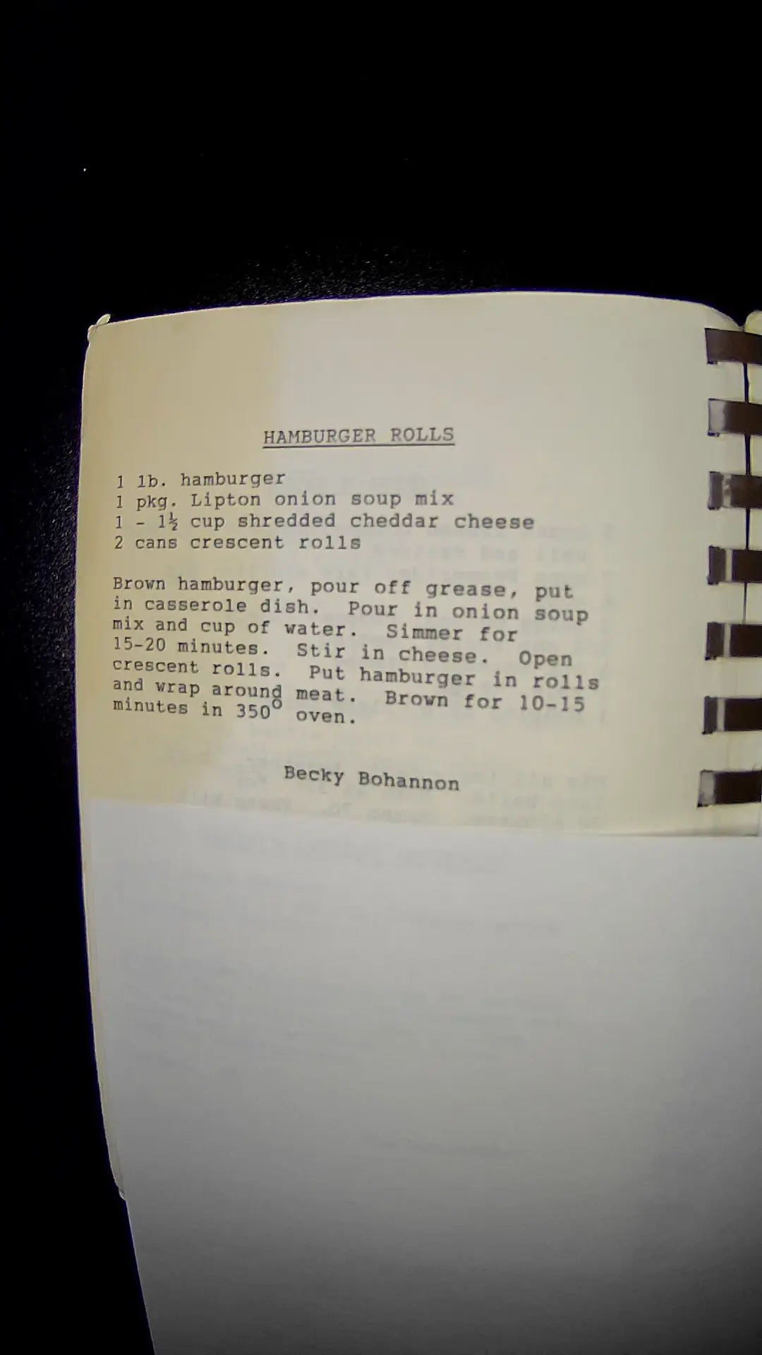 Here’s the text from the image: **HAMBURGER ROLLS** - 1 lb. hamburger - 1 pkg. Lipton onion soup mix - 1 - 1½ cup shredded cheddar cheese - 2 cans crescent rolls Brown hamburger, pour off grease, put in casserole dish. Pour in onion soup mix and cup of water. Simmer for 15-20 minutes. Stir in cheese. Open crescent rolls. Put hamburger in rolls and wrap around meat. Brown for 10-15 minutes in 350°F oven. **Becky Bohannon**llm