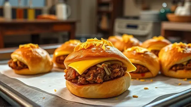 # Becky's Cheesy Hamburger Rolls 🍔🧀 These cheesy hamburger rolls are a quick and delightful treat perfect for game day, family gatherings, or a casual weeknight dinner. With a savory filling wrapped in flaky crescent rolls, they're sure to become a family favorite! Pair them with your favorite dipping sauces or a fresh side salad for a complete meal. 🥗 ## Ingredients ### For the filling - 1 lb. ground beef - 1 package Lipton onion soup mix - 1 - 1½ cups shredded cheddar cheese ### For the wrap - 2 cans refrigerated crescent rolls ## Instructions 1. In a skillet, brown the ground beef over medium heat until fully cooked. Drain any excess grease. > 🍳 A good tip is to use lean ground beef to reduce grease and improve the overall texture of the rolls! 2. Add the onion soup mix and 1 cup of water to the skillet. Stir well and let it simmer for about 15-20 minutes, allowing the flavors to meld. 3. Stir in the shredded cheddar cheese until melted and fully combined. 4. Preheat your oven to 350°F (175°C). 5. Open the crescent rolls and carefully separate the triangles. 6. Place a spoonful of the beef and cheese mixture in the center of each triangle. Wrap the dough around the filling, pinching the edges to seal tightly. > ✨ You can get creative with shapes! Try twisting or braiding the rolls for a fun presentation. 7. Arrange the wrapped rolls on a baking sheet and bake in the preheated oven for 10-15 minutes, or until the rolls are golden brown. ## Serving Suggestions - Serve these rolls with ketchup, mustard, or BBQ sauce for dipping. Consider adding pickles or jalapeños for an extra kick! 🌶️ - Pair with a side of crispy potato wedges or a light coleslaw to balance the richness of the rolls. ## Variations - **Southwestern Style**: Add some diced green chilies and corn to the beef mixture for a zesty twist! 🌽 - **Veggie-Loaded**: Mix in sautéed bell peppers, onions, or mushrooms with the ground beef for added vegetables. - **Cheesy Garlic**: Brush the wrapped rolls with garlic butter before baking for an irresistible flavor boost! 🧄 - **Make It Spicy**: Use pepper jack cheese and add diced jalapeños for a spicy version that packs a punch! Enjoy these deliciously cheesy hamburger rolls with your friends and family! 🎉name