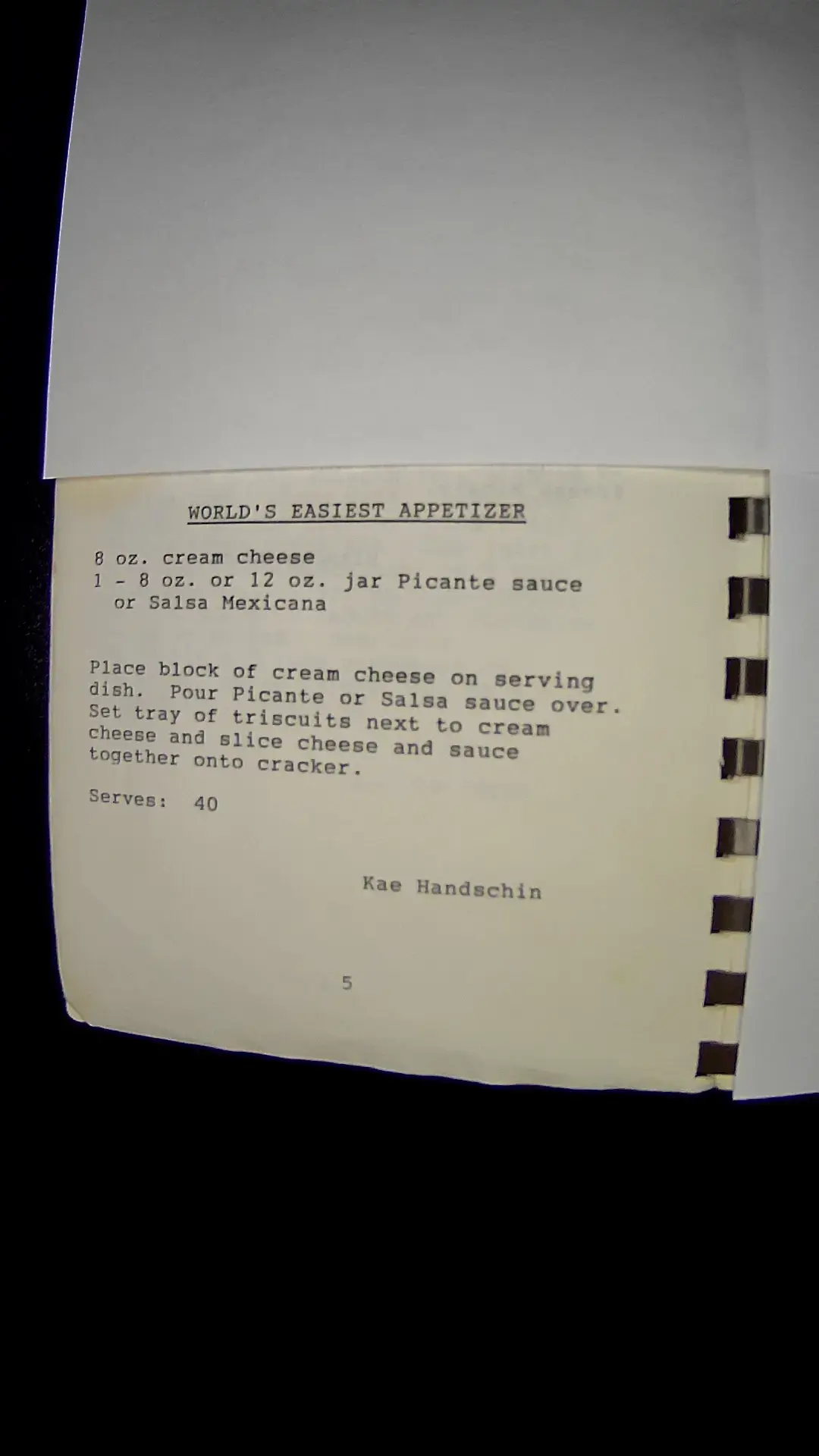 Here’s the text from the image: --- **WORLD'S EASIEST APPETIZER** 8 oz. cream cheese 1 - 8 oz. or 12 oz. jar Picante sauce or Salsa Mexicana Place block of cream cheese on serving dish. Pour Picante or Salsa sauce over. Set tray of triscuits next to cream cheese and slice cheese and sauce together onto cracker. Serves: 40 Kae Handschin ---llm