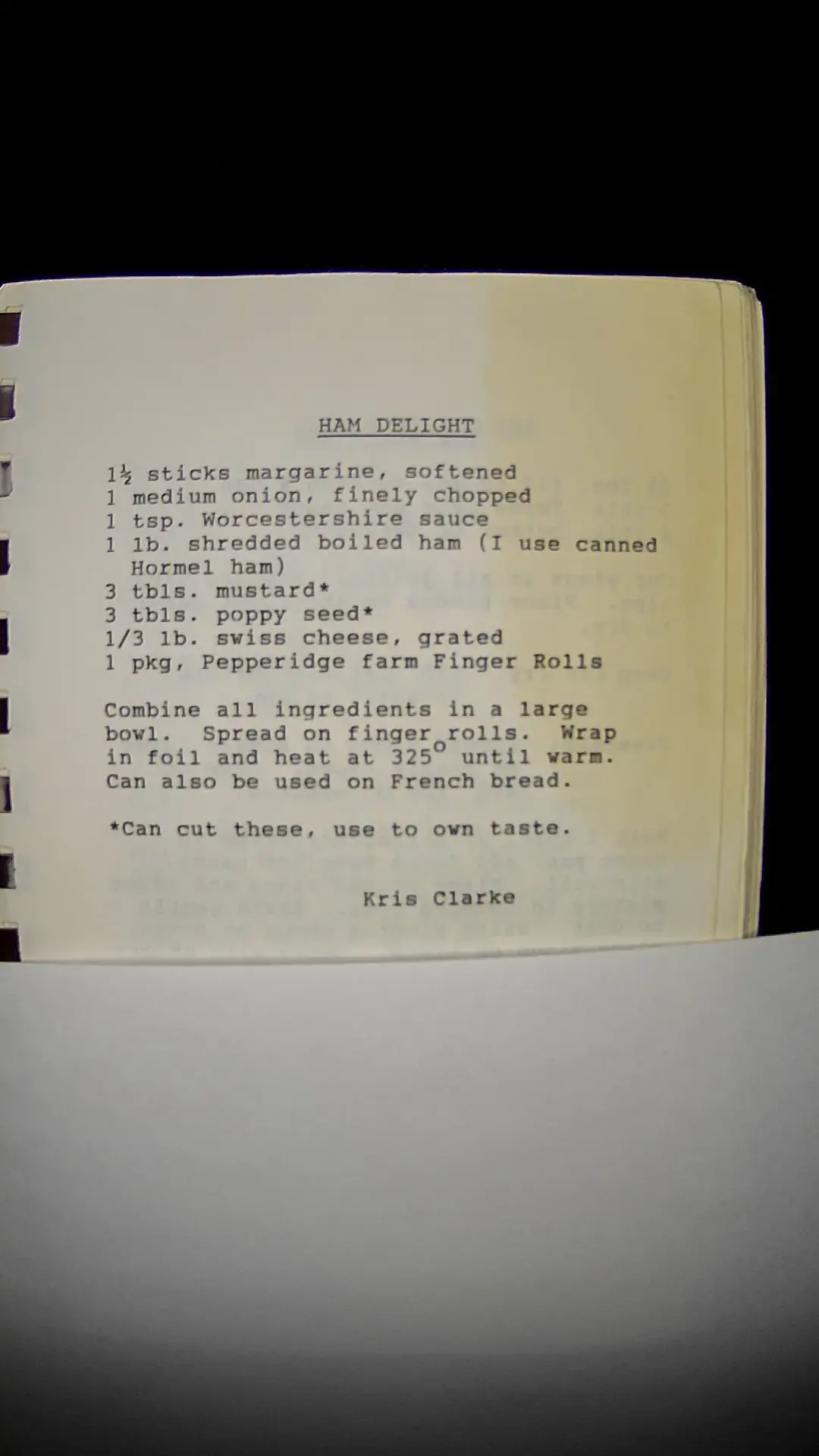 Certainly! Here’s the text from the image: --- **HAM DELIGHT** 1½ sticks margarine, softened 1 medium onion, finely chopped 1 tsp. Worcestershire sauce 1 lb. shredded boiled ham (I use canned Hormel ham) 3 tbls. mustard* 3 tbls. poppy seed* 1/3 lb. swiss cheese, grated 1 pkg. Pepperidge farm Finger Rolls Combine all ingredients in a large bowl. Spread on finger rolls. Wrap in foil and heat at 325° until warm. Can also be used on French bread. *Can cut these, use to own taste. Kris Clarke ---llm