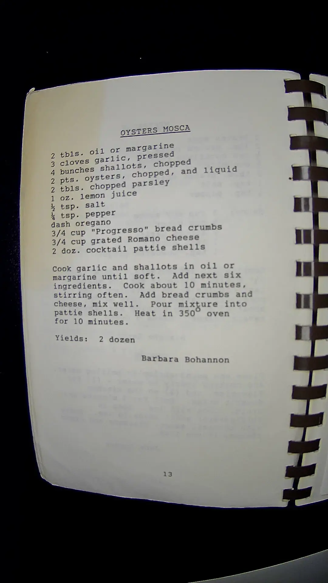 Sure! Here’s the text from the image: --- **OYSTERS MOSCA** - 2 tbls. oil or margarine - 3 cloves garlic, pressed - 4 bunches shallots, chopped - 2 pts. oysters, chopped, and liquid - 2 tbls. chopped parsley - 1 oz. lemon juice - ½ tsp. salt - ¾ tsp. pepper - dash oregano - ¾ cup "Progresso" bread crumbs - ¾ cup grated Romano cheese - 2 doz. cocktail pattie shells **Instructions:** Cook garlic and shallots in oil or margarine until soft. Add next six ingredients. Cook about 10 minutes, stirring often. Add bread crumbs and cheese, mix well. Pour mixture into pattie shells. Heat in 350° oven for 10 minutes. **Yields:** 2 dozen *Barbara Bohannon*llm