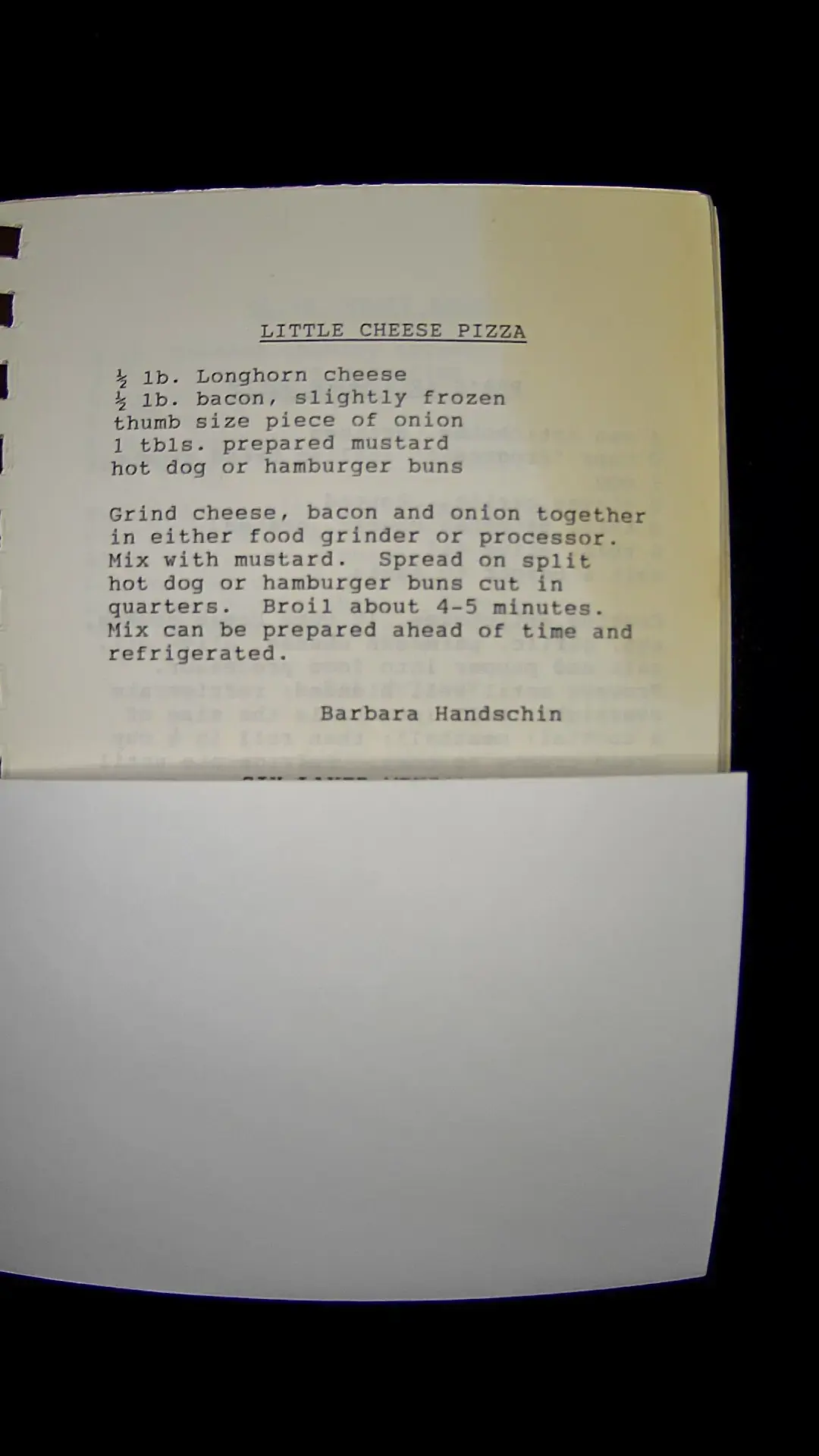 Sure! Here’s the text from the image: --- LITTLE CHEESE PIZZA ½ lb. Longhorn cheese ½ lb. bacon, slightly frozen thumb size piece of onion 1 tbls. prepared mustard hot dog or hamburger buns Grind cheese, bacon and onion together in either food grinder or processor. Mix with mustard. Spread on split hot dog or hamburger buns cut in quarters. Broil about 4-5 minutes. Mix can be prepared ahead of time and refrigerated. Barbara Handschin --- Let me know if you need any more help!llm