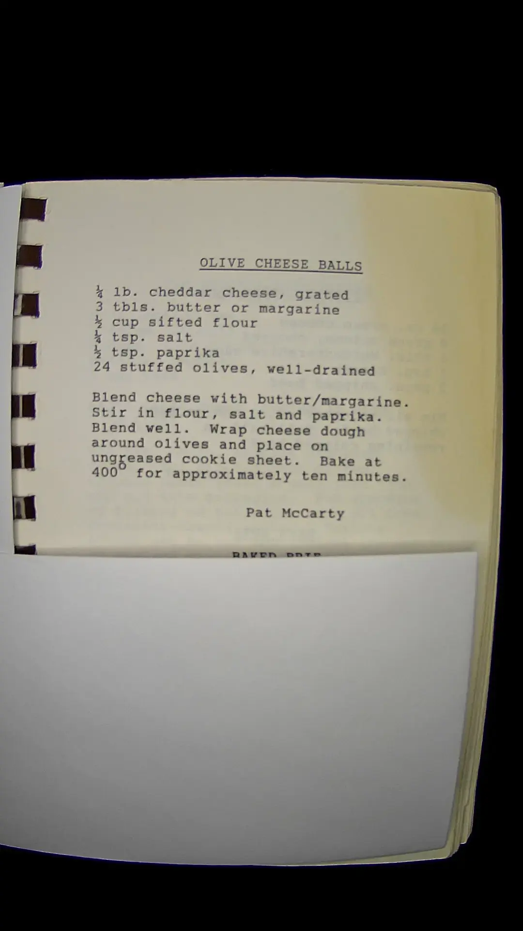 Here's the text from the image: --- **OLIVE CHEESE BALLS** - ½ lb. cheddar cheese, grated - 3 tbls. butter or margarine - ½ cup sifted flour - ½ tsp. salt - ¼ tsp. paprika - 24 stuffed olives, well-drained Blend cheese with butter/margarine. Stir in flour, salt, and paprika. Blend well. Wrap cheese dough around olives and place on ungreased cookie sheet. Bake at 400° for approximately ten minutes. Pat McCarty --- Let me know if you need anything else!llm