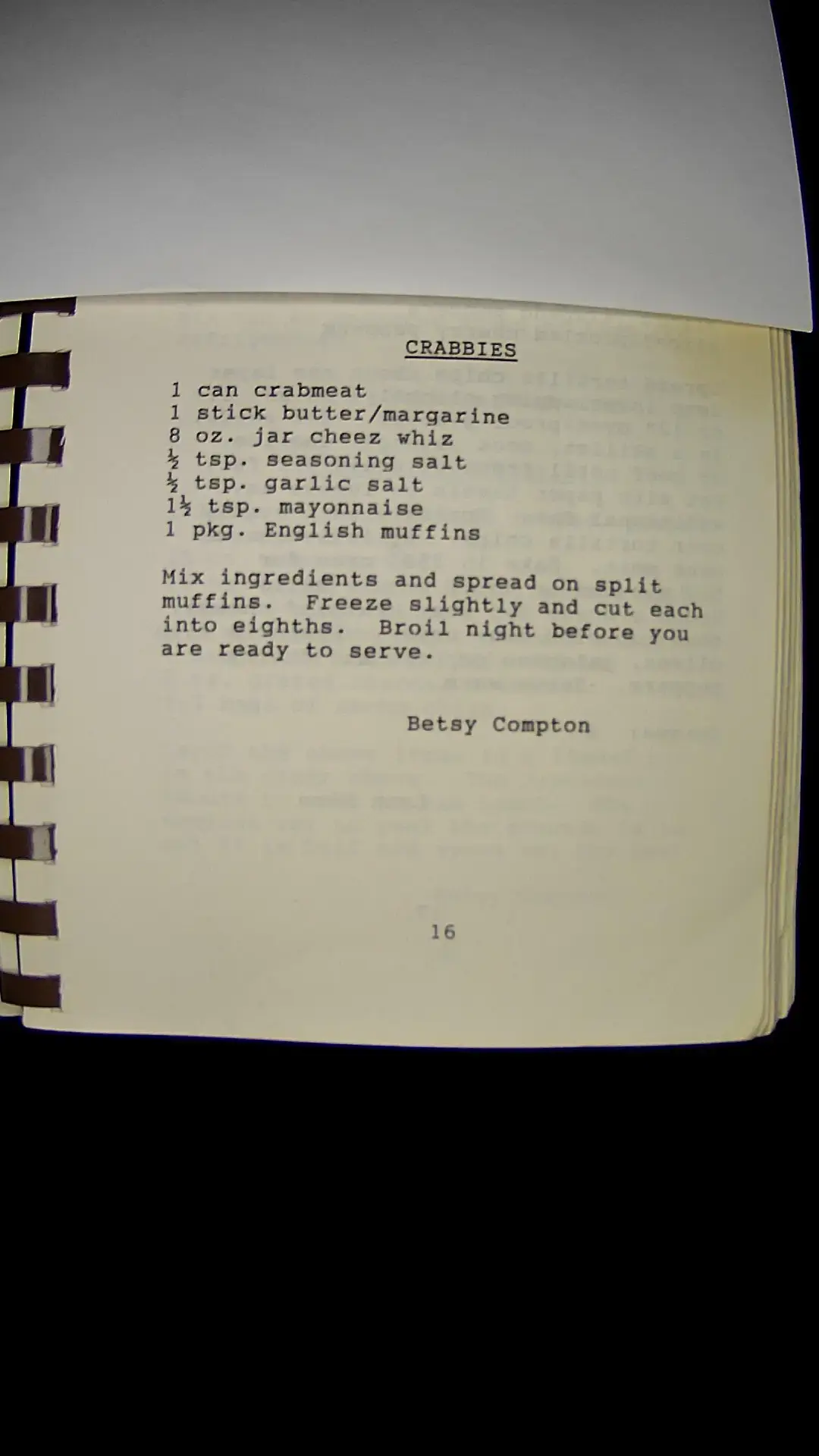 Here is the text from the image: **CRABBIES** - 1 can crabmeat - 1 stick butter/margarine - 8 oz. jar cheez whiz - Β½ tsp. seasoning salt - Β½ tsp. garlic salt - 1Β½ tsp. mayonnaise - 1 pkg. English muffins Mix ingredients and spread on split muffins. Freeze slightly and cut each into eighths. Broil night before you are ready to serve. Betsy Comptonllm