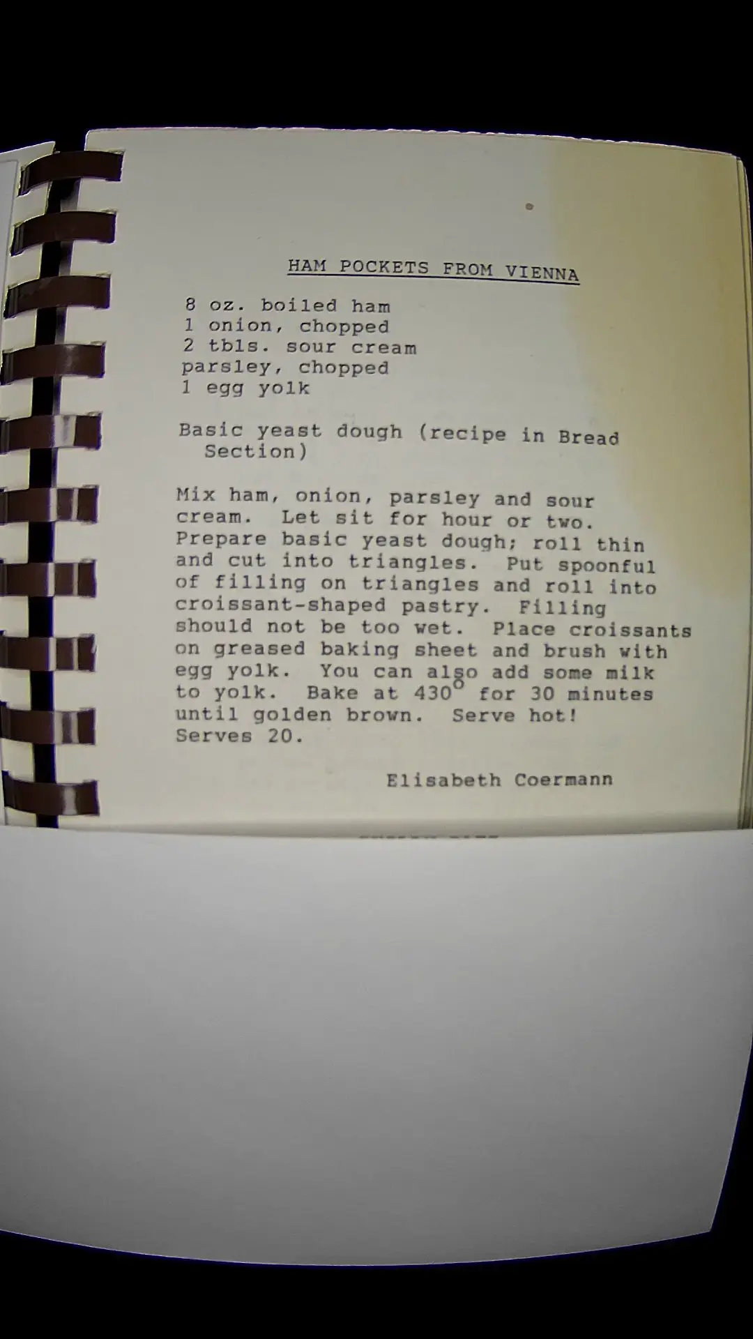 Sure! Here’s the text from the image: --- **HAM POCKETS FROM VIENNA** 8 oz. boiled ham 1 onion, chopped 2 tbls. sour cream parsley, chopped 1 egg yolk Basic yeast dough (recipe in Bread Section) Mix ham, onion, parsley, and sour cream. Let sit for an hour or two. Prepare basic yeast dough; roll thin and cut into triangles. Put spoonful of filling on triangles and roll into croissant-shaped pastry. Filling should not be too wet. Place croissants on greased baking sheet and brush with egg yolk. You can also add some milk to yolk. Bake at 430°F for 30 minutes until golden brown. Serve hot! Serves 20. **Elisabeth Coermann**llm