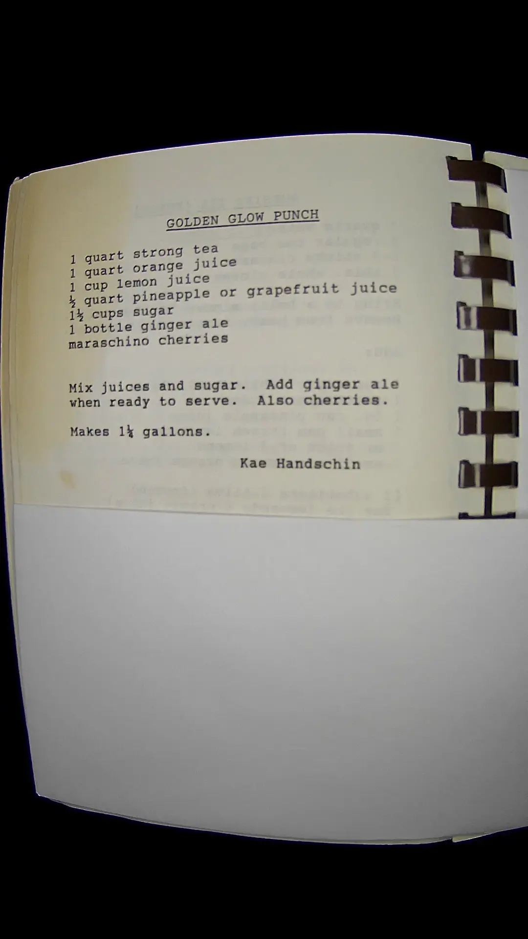 Here's the text from the image: **GOLDEN GLOW PUNCH** - 1 quart strong tea - 1 quart orange juice - 1 cup lemon juice - ยฝ quart pineapple or grapefruit juice - 1ยฝ cups sugar - 1 bottle ginger ale - maraschino cherries Mix juices and sugar. Add ginger ale when ready to serve. Also cherries. Makes 1ยฝ gallons. Kae Handschinllm