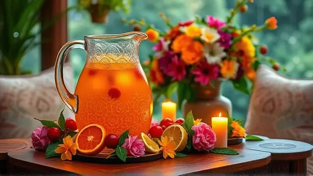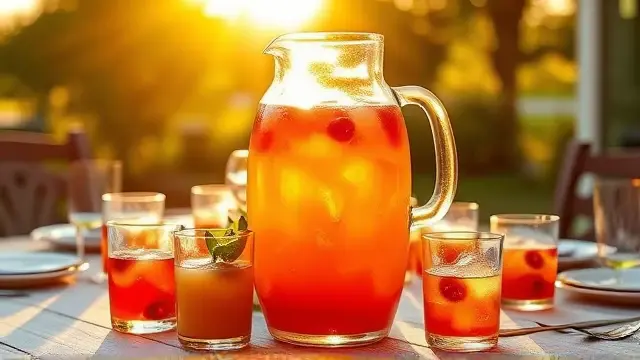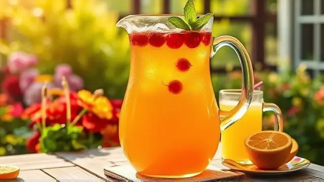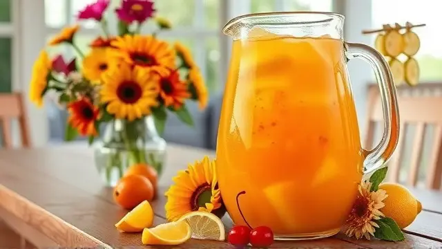 # Kae's Golden Glow Punch ๐นโจ This refreshing and vibrant punch is a fantastic drink for gatherings, parties, or just a sunny afternoon! With its bright flavors of citrus and a fizzy finish from the ginger ale, this punch is not only delicious but also visually appealing. Perfect for both kids and adults, it provides a burst of tropical delight in every sip! ๐๐ ### Serving Suggestion Consider serving this punch in a large bowl or a drink dispenser, garnished with fresh fruit slices or a few maraschino cherries for a festive touch! ๐ฅณ ## Ingredients - **1 quart** strong brewed tea (chilled) - **1 quart** orange juice (freshly squeezed is best!) - **1 cup** freshly squeezed lemon juice - **ยฝ quart** pineapple juice or grapefruit juice (your choice!) - **1ยฝ cups** sugar (adjust to taste) - **1 bottle** ginger ale (add just before serving for fizz) - **Maraschino cherries** (for garnish) ## Instructions 1. In a large punch bowl, combine the chilled tea, orange juice, lemon juice, pineapple (or grapefruit) juice, and sugar. 2. Stir well until the sugar is completely dissolved. > ๐ฏ **Tip**: If you prefer a sweeter punch, feel free to add more sugar or a splash of simple syrup. For a healthier option, you can use stevia or honey! 3. Refrigerate the mixture for at least an hour to let the flavors meld. 4. Just before serving, add the ginger ale for that fizzy kick! 5. Gently mix in maraschino cherries for a pop of color and flavor. > ๐ If desired, you can also add some sliced limes or oranges as additional garnishes, adding both beauty and taste! ## Variations - **Citrus Passion**: Add some passion fruit juice for an exotic flavor twist! ๐ - **Herbal Twist**: Infuse your tea with fresh mint before mixing for a refreshing herbal note. ๐ฟ - **Sparkling**: Substitute sparkling water for ginger ale if you prefer a less sweet, more subtle sparkle. - **Mocktail Version**: Omit the ginger ale and serve over ice as a non-fizzy treat for kids! This punch recipe makes approximately **1ยฝ gallons**, perfect for sharing with family and friends. Enjoy the sunny vibes it brings! โ๏ธ๐ฅname