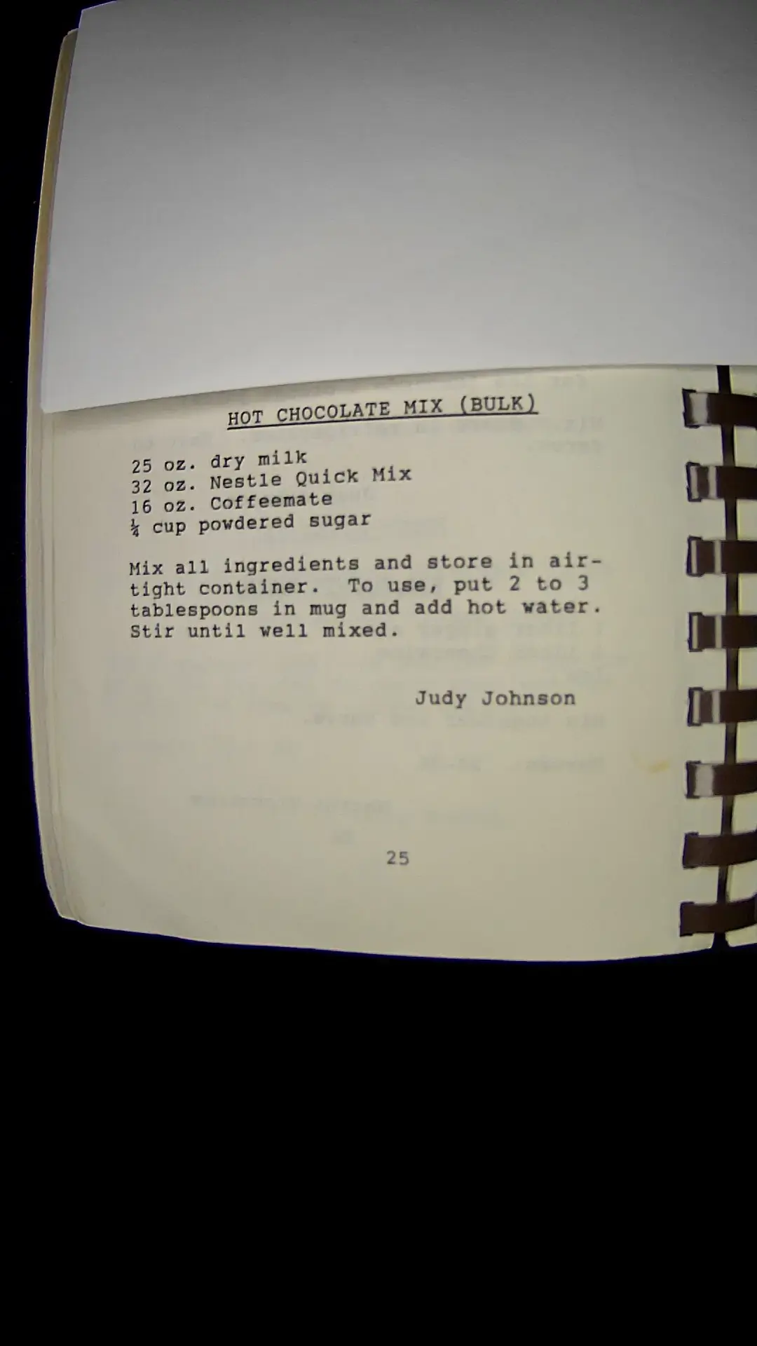 Here’s the text from the image: **HOT CHOCOLATE MIX (BULK)** - 25 oz. dry milk - 32 oz. Nestle Quick Mix - 16 oz. Coffeemate - ½ cup powdered sugar Mix all ingredients and store in an airtight container. To use, put 2 to 3 tablespoons in a mug and add hot water. Stir until well mixed. **Judy Johnson**llm