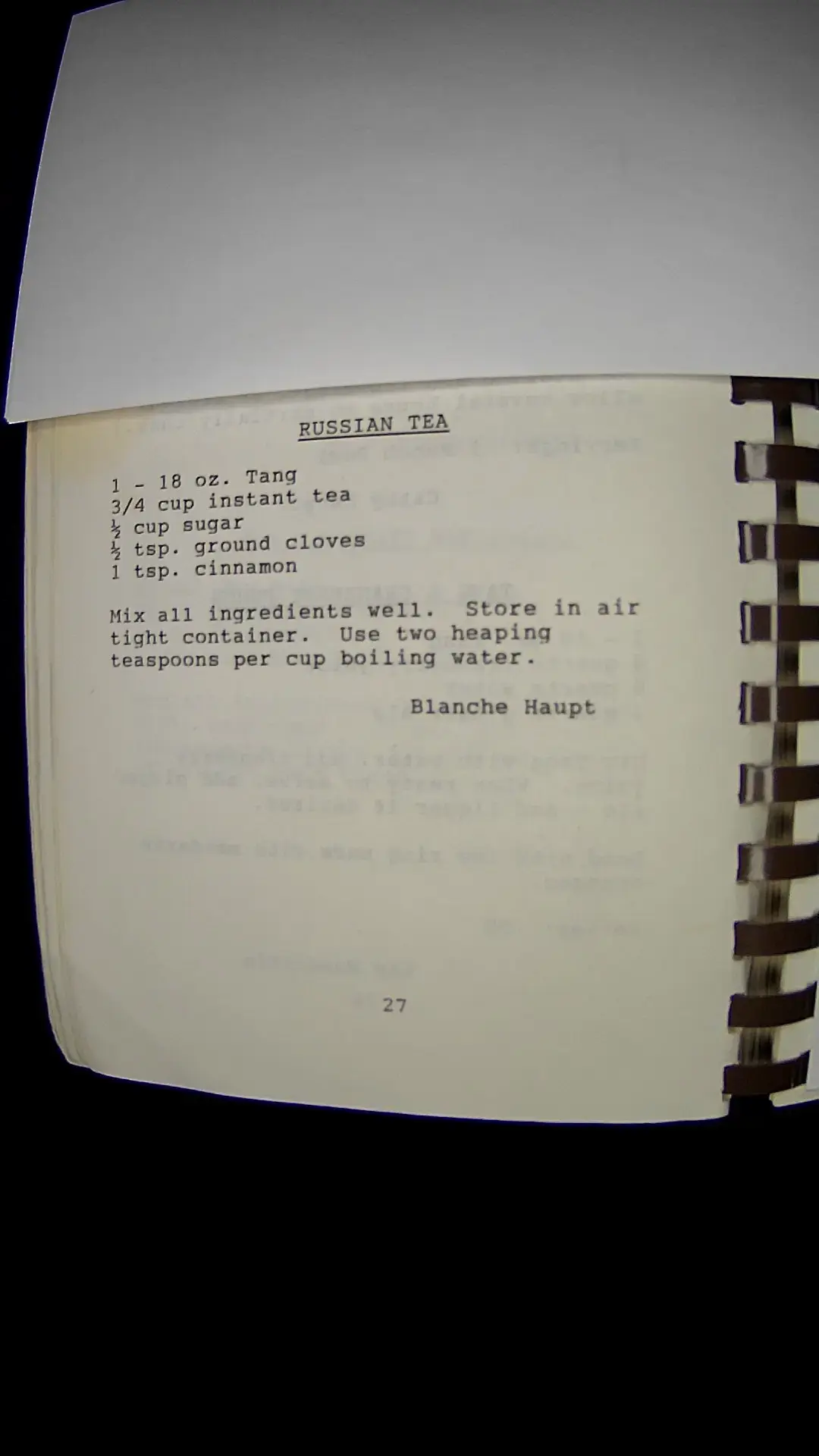 Here's the text from the image: **RUSSIAN TEA** - 1 - 18 oz. Tang - 3/4 cup instant tea - 1/2 cup sugar - 1/2 tsp. ground cloves - 1 tsp. cinnamon Mix all ingredients well. Store in an airtight container. Use two heaping teaspoons per cup of boiling water. **Blanche Haupt**llm