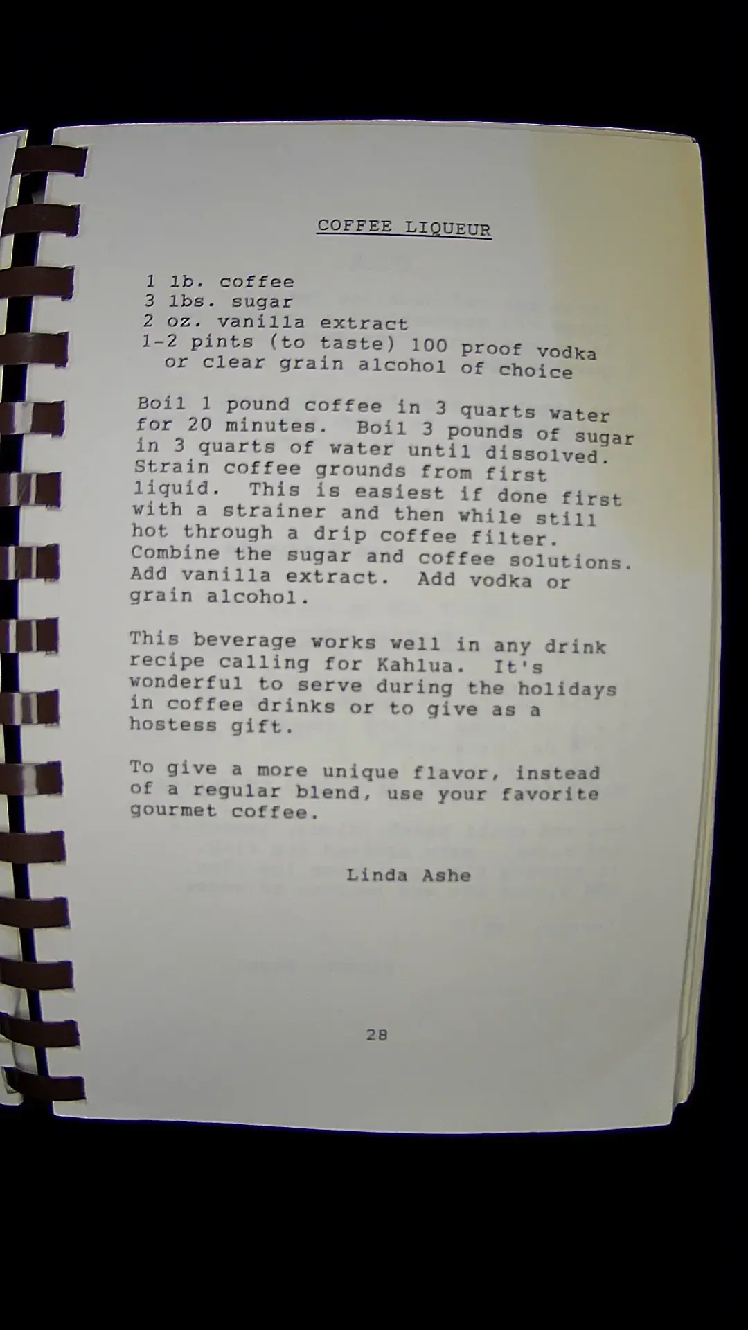 Hereβs the text from the image: --- **COFFEE LIQUEUR** 1 lb. coffee 3 lbs. sugar 2 oz. vanilla extract 1-2 pints (to taste) 100 proof vodka or clear grain alcohol of choice Boil 1 pound coffee in 3 quarts water for 20 minutes. Boil 3 pounds of sugar in 3 quarts of water until dissolved. Strain coffee grounds from first liquid. This is easiest if done first with a strainer and then while still hot through a drip coffee filter. Combine the sugar and coffee solutions. Add vanilla extract. Add vodka or grain alcohol. This beverage works well in any drink recipe calling for Kahlua. Itβs wonderful to serve during the holidays in coffee drinks or to give as a hostess gift. To give a more unique flavor, instead of a regular blend, use your favorite gourmet coffee. **Linda Ashe** 28 ---llm