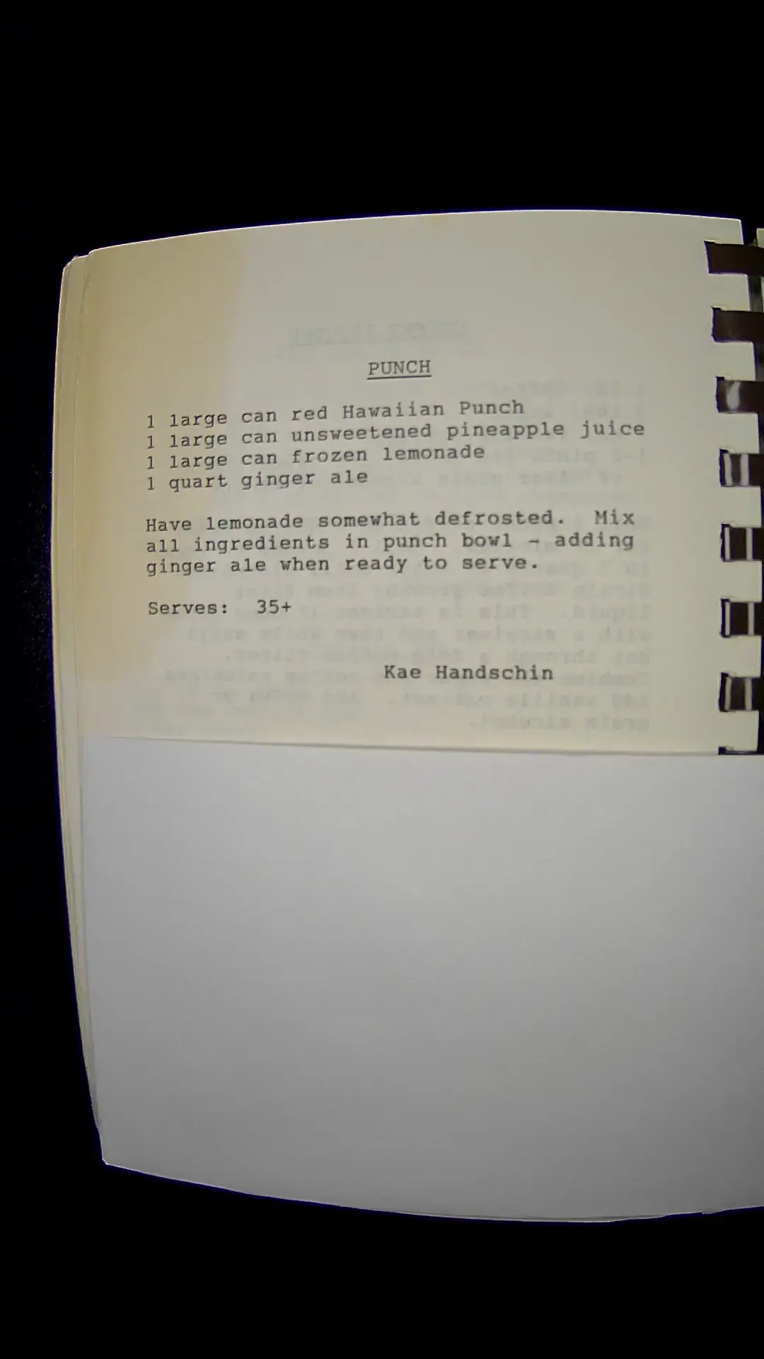 Hereβs the text from the image: **PUNCH** - 1 large can red Hawaiian Punch - 1 large can unsweetened pineapple juice - 1 large can frozen lemonade - 1 quart ginger ale Have lemonade somewhat defrosted. Mix all ingredients in punch bowl, adding ginger ale when ready to serve. Serves: 35+ **Kae Handschin**llm