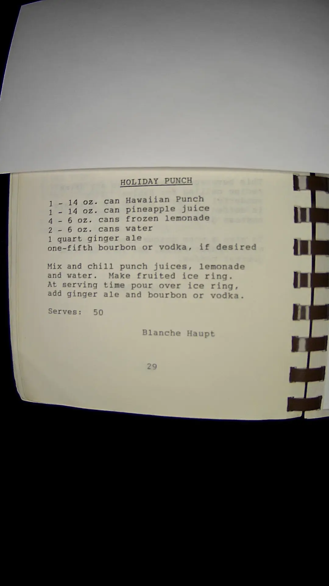Here is the text from the image: **HOLIDAY PUNCH** - 1 - 14 oz. can Hawaiian Punch - 1 - 14 oz. can pineapple juice - 4 - 6 oz. cans frozen lemonade - 2 - 6 oz. cans water - 1 quart ginger ale - one-fifth bourbon or vodka, if desired Mix and chill punch juices, lemonade, and water. Make fruited ice ring. At serving time pour over ice ring, add ginger ale and bourbon or vodka. Serves: 50 **Blanche Haupt** Page 29llm