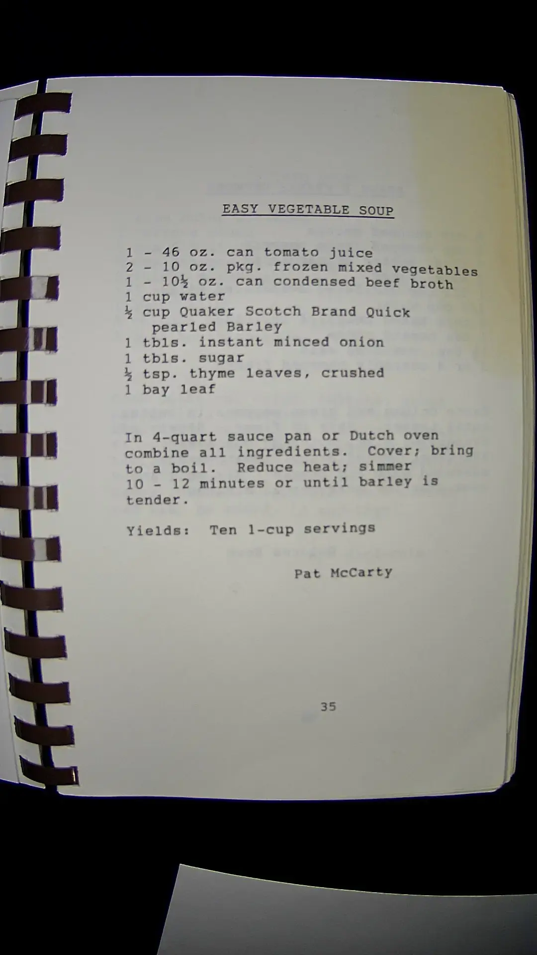Here's the text from the image: --- **EASY VEGETABLE SOUP** 1 - 46 oz. can tomato juice 2 - 10 oz. pkg. frozen mixed vegetables 1 - 10½ oz. can condensed beef broth 1 cup water ½ cup Quaker Scotch Brand Quick pearled barley 1 tbls. instant minced onion 1 tbls. sugar ½ tsp. thyme leaves, crushed 1 bay leaf In 4-quart sauce pan or Dutch oven combine all ingredients. Cover; bring to a boil. Reduce heat; simmer 10 - 12 minutes or until barley is tender. Yields: Ten 1-cup servings Pat McCarty ---llm