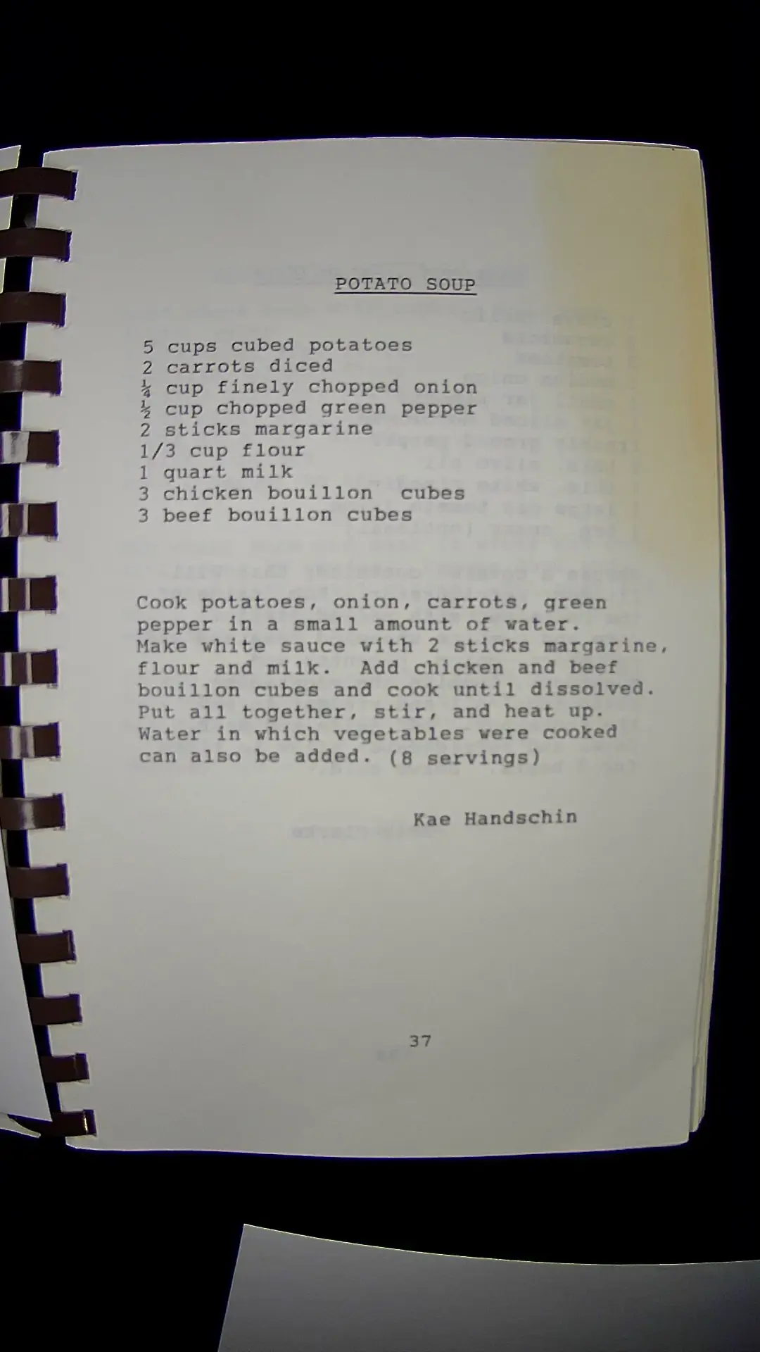 Here's the text from the image: **POTATO SOUP** - 5 cups cubed potatoes - 2 carrots diced - ¼ cup finely chopped onion - ½ cup chopped green pepper - 2 sticks margarine - ⅓ cup flour - 1 quart milk - 3 chicken bouillon cubes - 3 beef bouillon cubes **Instructions:** Cook potatoes, onion, carrots, green pepper in a small amount of water. Make white sauce with 2 sticks margarine, flour, and milk. Add chicken and beef bouillon cubes and cook until dissolved. Put all together, stir, and heat up. Water in which vegetables were cooked can also be added. (8 servings) *Kae Handschin*llm