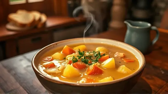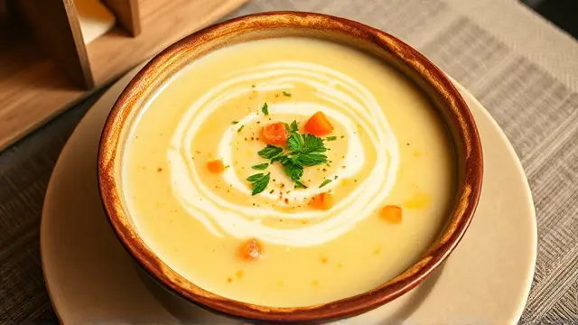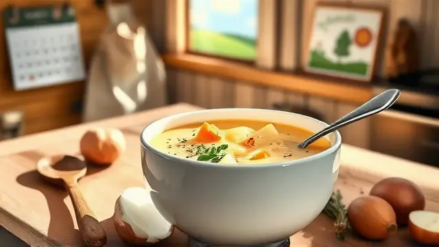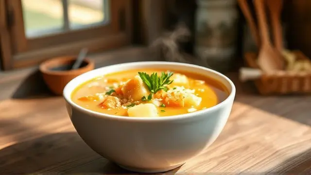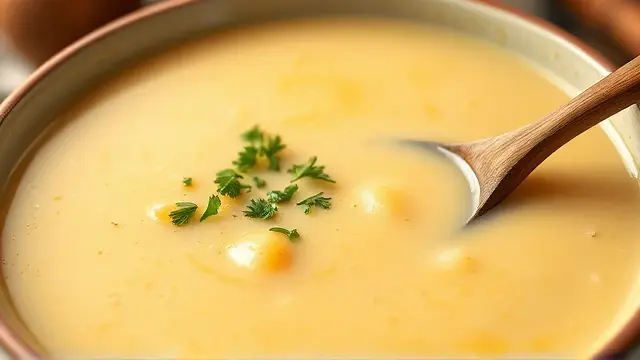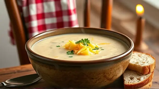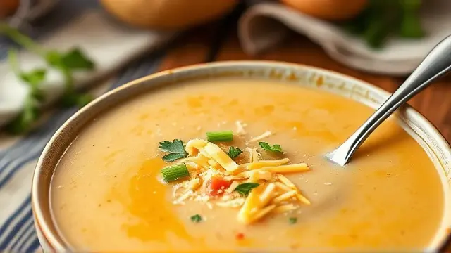 # Kae's Creamy Potato Soup 🥔🍲 Warm, comforting, and incredibly easy to make, this creamy potato soup is the perfect dish for chilly days or whenever you desire a hearty meal. With its smooth texture and rich flavors, it’s bound to become a family favorite! 💖 Consider pairing it with some fresh bread or a garden salad for a complete meal. ## Ingredients ### For the soup base - 5 cups cubed potatoes (about 4 medium-sized) - 2 carrots, diced - 1/4 cup finely chopped onion - 1/2 cup chopped green pepper ### For the creamy sauce - 2 sticks margarine (1/2 cup) - 1/3 cup all-purpose flour - 1 quart milk (preferably whole milk for creaminess) ### For the broth - 3 chicken bouillon cubes - 3 beef bouillon cubes - Water (from cooking vegetables, as needed) ## Instructions - In a large pot, combine the cubed potatoes, diced carrots, chopped onion, and green pepper. Add just enough water to cover the vegetables and cook until they are tender (about 15 minutes). > 🕒 Pro Tip: Keep an eye on the water level to ensure the vegetables don’t boil dry! - In a separate saucepan, melt the margarine over medium heat. Once melted, whisk in the flour to make a roux. Gradually add the milk, stirring constantly, until the sauce thickens and is smooth. > ⭐ A little secret: For a richer flavor, you can sauté some garlic in the margarine before adding the flour! - Add the chicken and beef bouillon cubes to the sauce, stirring until fully dissolved. - Combine the cooked vegetables with the creamy sauce in the large pot. If you need to thin it out, add some of the water used to cook the vegetables until you reach your desired consistency. - Heat through on low, stirring occasionally. > 🍽️ Serve hot and enjoy the comfort in every spoonful! ## Variations - **Vegetarian Option**: Simply use all vegetable bouillon cubes instead of chicken and beef for a meat-free version. - **Herb Infusion**: Add fresh thyme, rosemary, or parsley for extra flavor. A tablespoon of dried herbs will work too! 🌿 - **Spicy Kick**: Toss in some diced jalapeños or a dash of cayenne pepper to give the soup a little heat! 🌶️ - **Creamy Texture**: For an even creamier soup, blend half of the finished soup in a blender, then mix it back into the rest. ## Serving Suggestions This potato soup pairs beautifully with crusty bread, grilled cheese sandwiches, or a light salad. Feel free to garnish with a sprinkle of fresh herbs or crumbled bacon for added flair! 🥓🥗 *Enjoy this delightful bowl of warmth made with love!* ❤️name