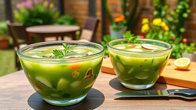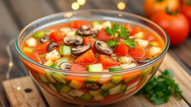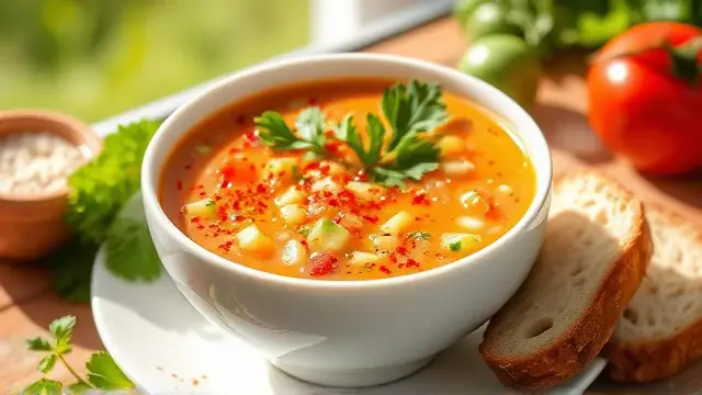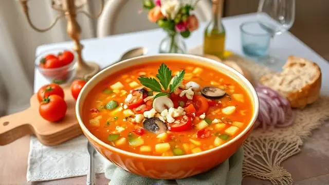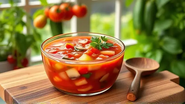 # Kris's Refreshing Gazpacho - Salad Soup 🍅🥒 Beat the heat with this vibrant and refreshing Gazpacho! This cold Spanish soup is packed with fresh vegetables, giving you a burst of flavors that are perfect for a hot day. Serve it as an appetizer or a light lunch, and impress your family and friends with this cool culinary delight! Pair it with crusty bread for dipping or a side of grilled shrimp for a delightful contrast. 🍞🍤 ## Ingredients ### For the Gazpacho - 1 clove of garlic - 2 cucumbers (preferably peeled) - 3 ripe tomatoes - 1 medium onion - 1 small jar of pimentos (drained) - 1 jar of sliced mushrooms (drained) - Freshly ground black pepper (to taste) - 2 tablespoons of olive oil - 1 tablespoon of white vinegar - 1 large can of tomato juice - 1 teaspoon of sugar (optional, to taste) ## Instructions 1. **Prepare the Container**: Choose a covered container that will fit nicely in your refrigerator. Rub the inside with the peeled garlic clove to infuse a subtle garlic flavor into the soup. 2. **Chop the Veggies**: Dice the cucumbers, tomatoes, onion, pimentos, and mushrooms into small pieces for a delightful texture. > 🥗 Tip: Leave the cucumbers unpeeled if you enjoy the extra crunch and nutrients from the skin! 3. **Mix It Up**: In the prepared container, combine the diced vegetables, freshly ground pepper, olive oil, white vinegar, and optional sugar. Stir until well mixed. 4. **Add the Juice**: Pour in the tomato juice and give it another stir. 5. **Chill Out**: Cover the container and refrigerate for at least 3 hours to allow the flavors to meld. > ❄️ Pro Tip: Gazpacho tastes even better the next day, so consider making it a day ahead! 6. **Serve Cold**: Enjoy your chilled Gazpacho straight from the fridge! Garnish with extra diced cucumbers or a drizzle of olive oil for an elegant touch. ## Variations - **Spice It Up**: Add diced jalapeños or a pinch of cayenne pepper for a kick of heat! 🌶️ - **Herb It Up**: Toss in fresh herbs like basil, cilantro, or parsley for added flavor. - **Creamy Option**: Blend a ripe avocado into the mixture for a creamier texture and an extra healthy boost. 🥑 - **Low-Sodium**: Use low-sodium tomato juice and skip the added sugar for a healthier dish that's still packed with flavor. --- Enjoy this delightful dish that’s as nutritious as it is refreshing! Cheers to summer meals that won't heat up your kitchen! 🥳name