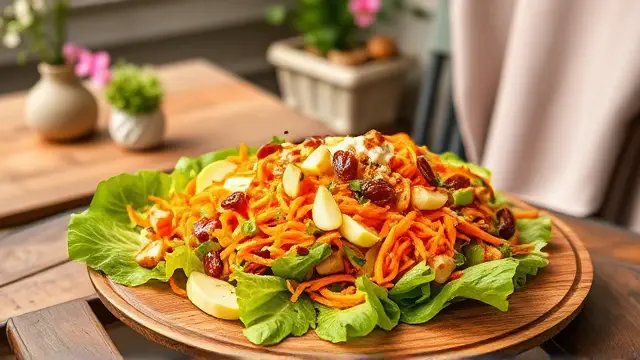 This vibrant and crunchy salad is a delightful combination of flavors and textures, perfect for adding some zing to your meal or serving as a refreshing side dish. With its sweet apples and raisins, along with the crispness of carrots and celery, this salad is both nourishing and satisfying. Enjoy it at picnics, barbecues, or as a bright addition to your lunch!