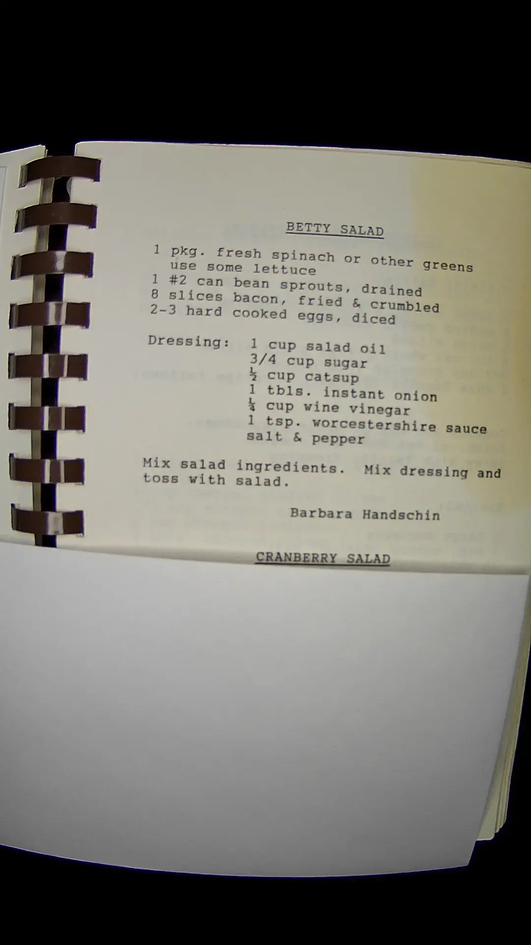 Here's the text from the image: **BETTY SALAD** - 1 pkg. fresh spinach or other greens (use some lettuce) - 1 (#2) can bean sprouts, drained - 8 slices bacon, fried & crumbled - 2-3 hard cooked eggs, diced **Dressing:** - 1 cup salad oil - 3/4 cup sugar - 1/2 cup catsup - 1 tbls. instant onion - 1/4 cup wine vinegar - 1 tsp. Worcestershire sauce - salt & pepper Mix salad ingredients. Mix dressing and toss with salad. **Barbara Handschin** **CRANBERRY SALAD**llm