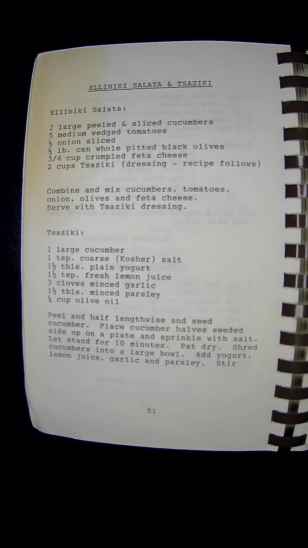 Here is the text from the image: --- **ELLINIKI SALATA & TSAZIKI** **Elliniki Salata:** - 2 large peeled & sliced cucumbers - 5 medium wedged tomatoes - ½ onion sliced - ½ lb. can whole pitted black olives - ¾ cup crumbled feta cheese - 2 cups Tsaziki (dressing - recipe follows) Combine and mix cucumbers, tomatoes, onion, olives, and feta cheese. Serve with Tsaziki dressing. **Tzaziki:** - 1 large cucumber - 1 tsp. coarse (Kosher) salt - 1½ tbls. plain yogurt - 1½ tsp. fresh lemon juice - 3 cloves minced garlic - 1½ tbls. minced parsley - ¾ cup olive oil Peel and half lengthwise and seed cucumber. Place cucumber halves seeded side up on a plate and sprinkle with salt. Let stand for 10 minutes. Pat dry. Shred cucumbers into a large bowl. Add yogurt, lemon juice, garlic, and parsley. Stir. --- Page 51llm