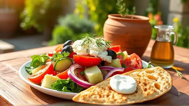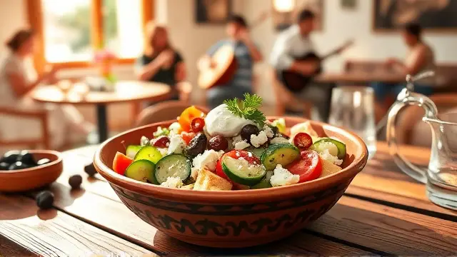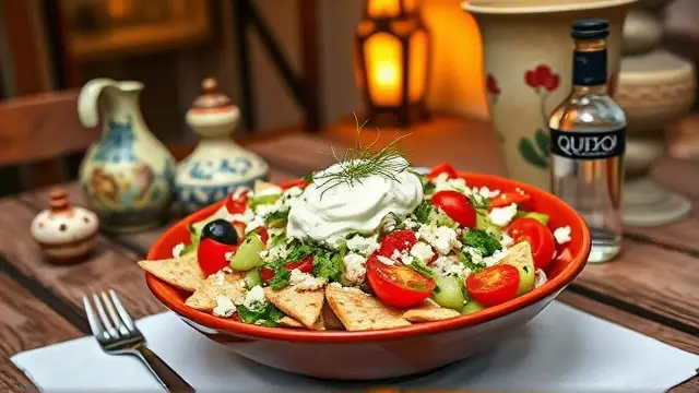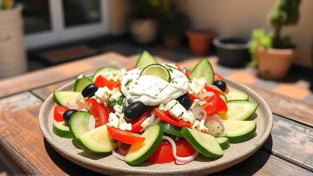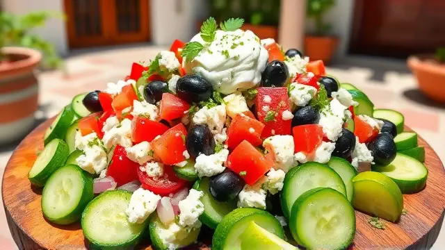 # Elliniki Salata with Creamy Tzatziki 🥗🧄 Fresh, vibrant, and full of flavor, Elliniki Salata is a classic Greek salad that brightens up any meal. Paired with homemade Tzatziki, it's a refreshing dish that is perfect as a side or a light main course. Ideal for warm days or get-togethers with friends, this combo is sure to impress! ## Ingredients ### For the Elliniki Salata - 2 large cucumbers, peeled & sliced - 5 medium tomatoes, wedged - ½ onion, sliced - ½ lb. can of whole pitted black olives - ¾ cup crumbled feta cheese - 2 cups Tzatziki dressing (recipe below) ### For the Tzatziki - 1 large cucumber - 1 tsp coarse (Kosher) salt - 1½ tbsp plain yogurt - 1½ tsp fresh lemon juice - 3 cloves garlic, minced - 1½ tbsp fresh parsley, minced - ¾ cup olive oil ## Instructions ### For the Elliniki Salata 1. In a large bowl, combine the sliced cucumbers, wedged tomatoes, sliced onion, whole olives, and crumbled feta cheese. 2. Gently toss the ingredients together to mix. > 🥗 For added crunch, try using heirloom tomatoes in different colors! Their variety will enhance the visual appeal of your salad. 3. Serve immediately with a generous drizzle of Tzatziki dressing. ### For the Tzatziki 1. Peel, halve, and seed the cucumber, then sprinkle the inside with salt. Let it sit for 10 minutes to draw out excess moisture. 2. Pat the cucumber dry with a paper towel and shred it into a large bowl. 3. Add the plain yogurt, lemon juice, minced garlic, and minced parsley to the shredded cucumber. 4. Stir in the olive oil until well combined. > 🧄 To add a spicy twist, incorporate a pinch of crushed red pepper flakes into your Tzatziki for a delightful kick! ## Tips & Variations - **Add Extra Veggies**: Consider incorporating bell peppers, radishes, or even avocado for an extra burst of flavor. - **Make it Vegan**: Replace the yogurt with a plant-based alternative, like coconut yogurt. - **Healthier Option**: Swap traditional feta for a lower-fat version or try a vegan feta for a lighter, dairy-free salad. - **Storage**: Both the salad and Tzatziki can be stored in the fridge for up to 2 days, making it a great meal prep option! Enjoy your delicious Elliniki Salata with creamy Tzatziki, and savor a taste of Greece right at home! 🇬🇷✨name