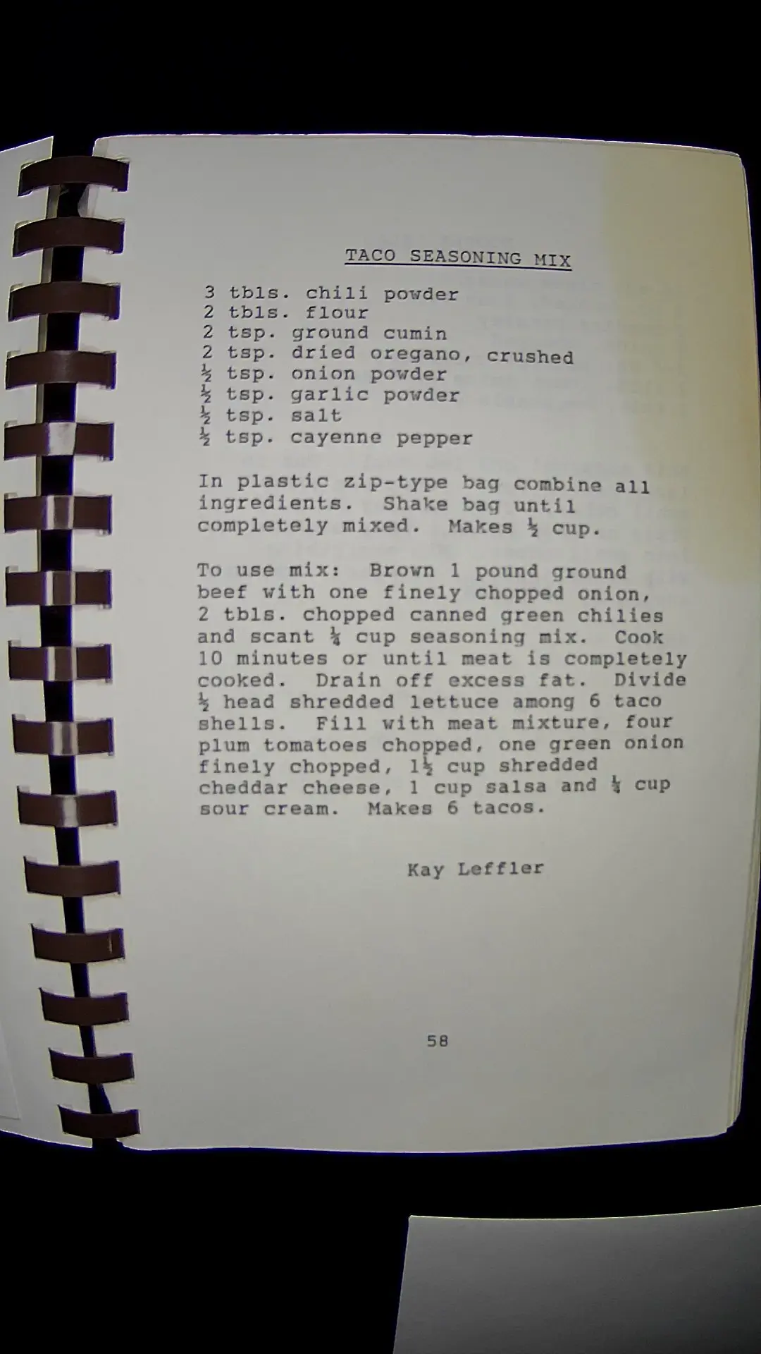 Here's the text from the image: --- **TACO SEASONING MIX** 3 tbls. chili powder 2 tbls. flour 2 tsp. ground cumin 2 tsp. dried oregano, crushed ½ tsp. onion powder ½ tsp. garlic powder ½ tsp. salt ½ tsp. cayenne pepper In a plastic zip-type bag, combine all ingredients. Shake bag until completely mixed. Makes ½ cup. **To use mix:** Brown 1 pound ground beef with one finely chopped onion, 2 tbls. chopped canned green chilies and scant ½ cup seasoning mix. Cook 10 minutes or until meat is completely cooked. Drain off excess fat. Divide ½ head shredded lettuce among 6 taco shells. Fill with meat mixture, four plum tomatoes chopped, one green onion finely chopped, 1½ cup shredded cheddar cheese, 1 cup salsa, and ½ cup sour cream. Makes 6 tacos. Kay Leffler 58 ---llm