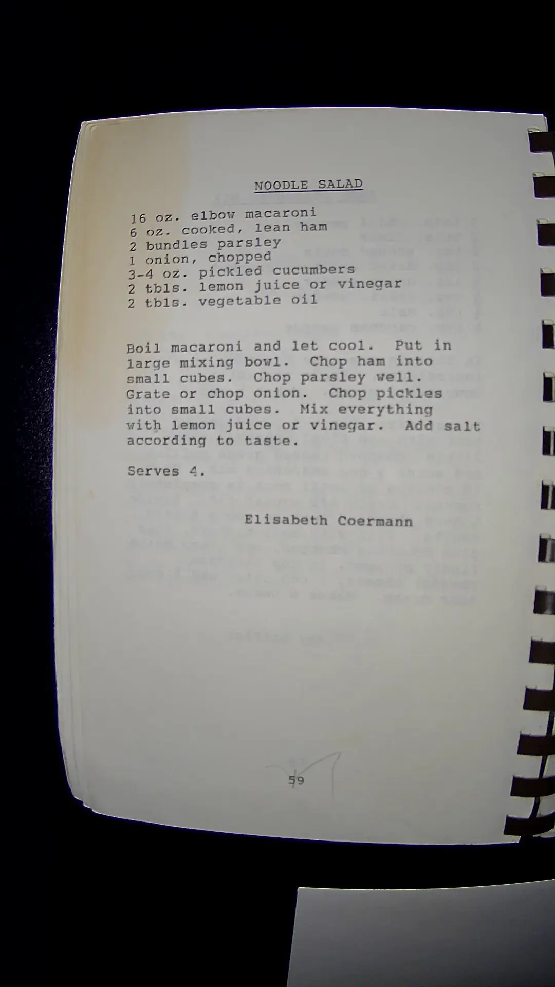 Here's the text from the image: **NOODLE SALAD** 16 oz. elbow macaroni 6 oz. cooked, lean ham 2 bundles parsley 1 onion, chopped 3-4 oz. pickled cucumbers 2 tbls. lemon juice or vinegar 2 tbls. vegetable oil Boil macaroni and let cool. Put in large mixing bowl. Chop ham into small cubes. Chop parsley well. Grate or chop onion. Chop pickles into small cubes. Mix everything with lemon juice or vinegar. Add salt according to taste. Serves 4. Elisabeth Coermannllm