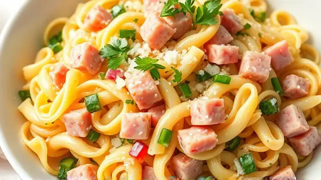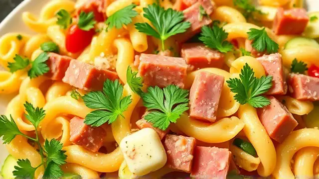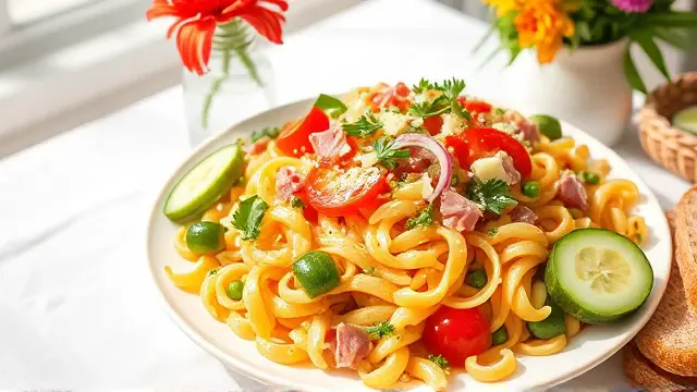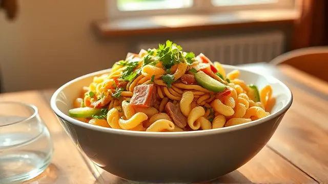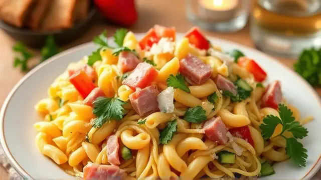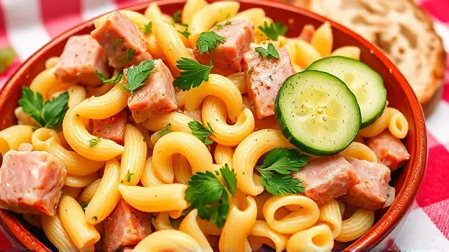 # Elisabeth's Refreshing Noodle Salad 🍜🥗 This delightful noodle salad is the perfect blend of flavors and textures, making it a fantastic side dish for barbecues, picnics, or even a light lunch. It's a breeze to prepare and can easily be customized to suit your taste preferences. Cool, tangy, and full of crunch, this dish is sure to be a crowd-pleaser! Perfect for hot summer days or as a make-ahead meal for busy weeks. ☀️🥒 ## Ingredients ### For the salad - 16 oz. elbow macaroni - 6 oz. cooked, lean ham - 2 bundles fresh parsley - 1 onion (finely chopped) - 3-4 oz. pickled cucumbers ### For the dressing - 2 tablespoons lemon juice or vinegar - 2 tablespoons vegetable oil - Salt and pepper to taste ## Instructions 1. **Cook the macaroni**: In a large pot, boil the elbow macaroni according to package instructions until al dente. Drain and let it cool completely. > 🔥 Tip: Rinse the macaroni with cold water after draining to stop the cooking process and help it cool faster. 2. **Prepare the ingredients**: While the macaroni cools, chop the cooked ham into small cubes, finely chop the parsley, and grate or chop the onion. 3. **Mix the salad**: In a large mixing bowl, combine the cooled macaroni, chopped ham, parsley, onion, and pickled cucumbers. 4. **Make the dressing**: In a small bowl, whisk together lemon juice (or vinegar), vegetable oil, salt, and pepper. 5. **Combine**: Pour the dressing over the salad mixture and toss everything together until well combined. > 🥗 Note: You can adjust the seasoning to taste. Feel free to add more lemon juice for brightness or additional oil for a richer flavor. 6. **Chill and serve**: Cover the salad and refrigerate for at least an hour to allow the flavors to meld. Serve chilled. ## Variations - **Vegetarian**: Omit the ham and add extra vegetables like bell peppers, cherry tomatoes, or chickpeas for added protein. - **Cheesy goodness**: Mix in some shredded cheese (cheddar or mozzarella works great) for a creamy texture. - **Herb-infused**: Experiment with different herbs like dill or basil to add a unique twist to your salad. - **Pasta alternatives**: Try using different pasta shapes like rotini or farfalli for a fun presentation! Enjoy this vibrant and comforting noodle salad as a refreshing addition to any meal! 🌿✨name