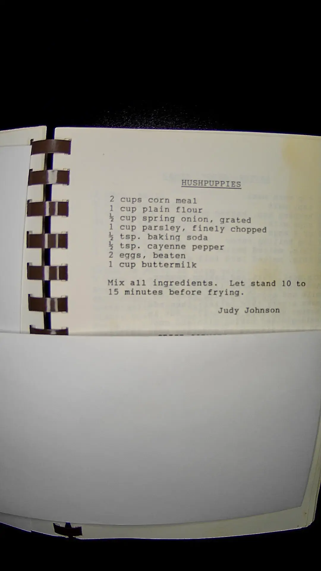 Here is the text from the image: **HUSHPUPPIES** - 2 cups corn meal - 1 cup plain flour - ½ cup spring onion, grated - 1 cup parsley, finely chopped - ½ tsp. baking soda - ½ tsp. cayenne pepper - 2 eggs, beaten - 1 cup buttermilk Mix all ingredients. Let stand 10 to 15 minutes before frying. Judy Johnsonllm
