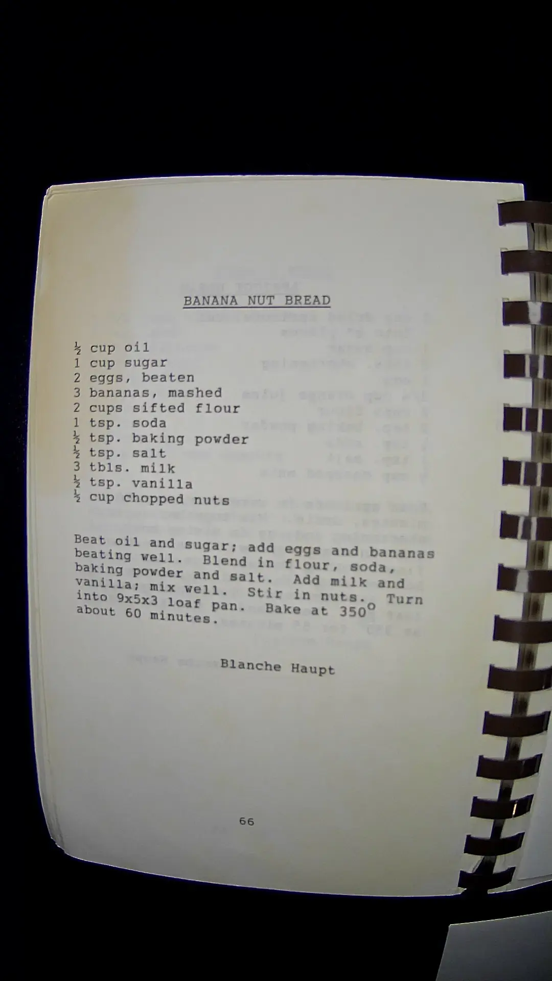 Here's the text from the image: **BANANA NUT BREAD** - ½ cup oil - 1 cup sugar - 2 eggs, beaten - 3 bananas, mashed - 2 cups sifted flour - 1 tsp. soda - ½ tsp. baking powder - ½ tsp. salt - 3 tbls. milk - ½ tsp. vanilla - ½ cup chopped nuts **Instructions:** Beat oil and sugar; add eggs and bananas, beating well. Blend in flour, soda, baking powder, and salt. Add milk and vanilla; mix well. Stir in nuts. Turn into a 9x5x3 loaf pan. Bake at 350° for about 60 minutes. *Blanche Haupt*llm