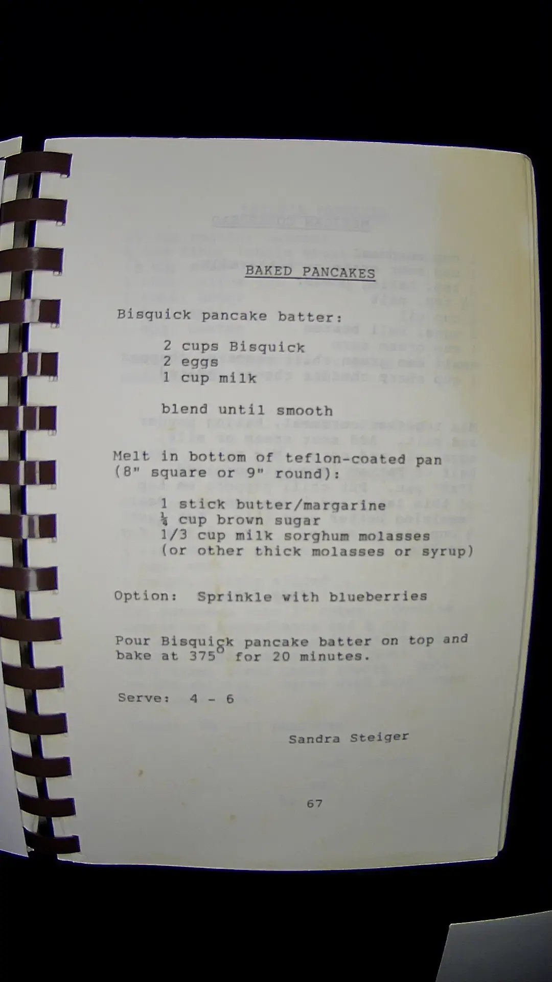 Here's the text from the image: **BAKED PANCAKES** **Bisquick pancake batter:** - 2 cups Bisquick - 2 eggs - 1 cup milk Blend until smooth. Melt in bottom of teflon-coated pan (8" square or 9" round): - 1 stick butter/margarine - Β½ cup brown sugar - β cup milk sorghum molasses (or other thick molasses or syrup) **Option:** Sprinkle with blueberries. Pour Bisquick pancake batter on top and bake at 375Β°F for 20 minutes. **Serve:** 4 - 6 **Sandra Steiger** 67llm