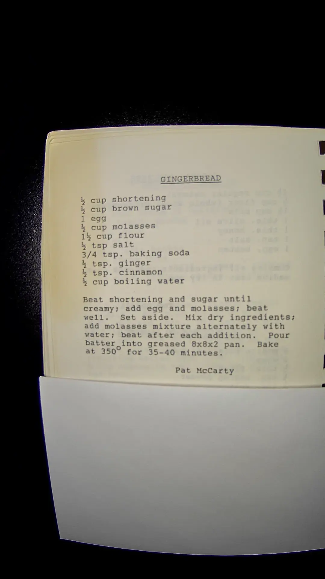 Here’s the text from the image: **GINGERBREAD** - ½ cup shortening - ½ cup brown sugar - 1 egg - ½ cup molasses - 1½ cup flour - 1 tsp salt - ¾ tsp baking soda - ½ tsp ginger - ½ tsp cinnamon - ½ cup boiling water **Instructions:** Beat shortening and sugar until creamy; add egg and molasses; beat well. Set aside. Mix dry ingredients; add molasses mixture alternately with water; beat after each addition. Pour batter into greased 8x8x2 pan. Bake at 350° for 35-40 minutes. **Pat McCarty**llm