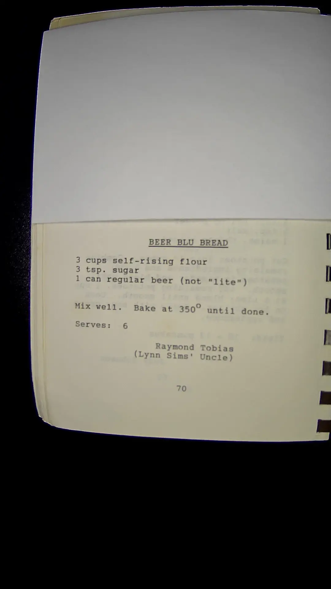 Here's the text from the image: **BEER BLU BREAD** - 3 cups self-rising flour - 3 tsp. sugar - 1 can regular beer (not "lite") Mix well. Bake at 350° until done. Serves: 6 Raymond Tobias (Lynn Sims' Uncle) 70llm