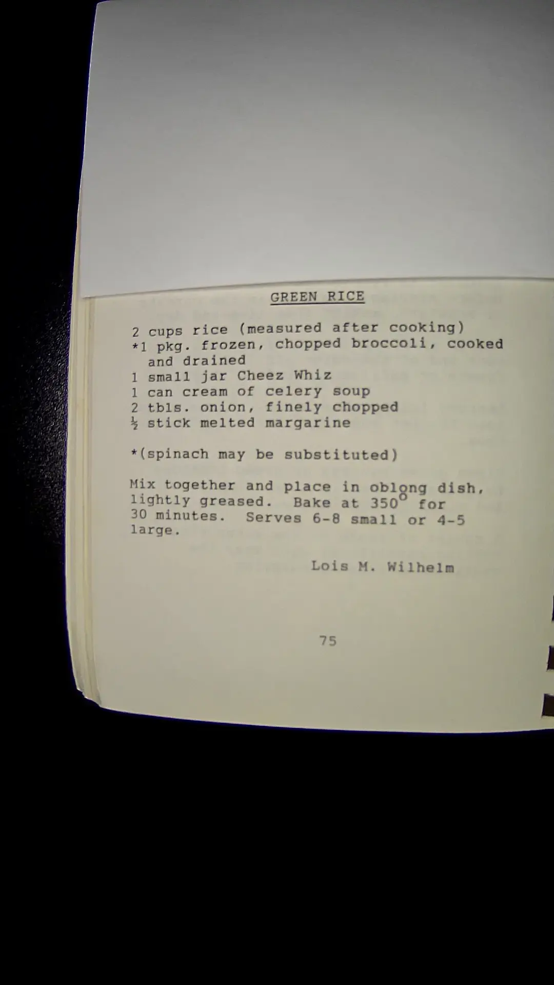 Here's the text from the image: --- **GREEN RICE** - 2 cups rice (measured after cooking) - 1 pkg. frozen, chopped broccoli, cooked and drained - 1 small jar Cheez Whiz - 1 can cream of celery soup - 2 tbls. onion, finely chopped - ½ stick melted margarine *(spinach may be substituted)* Mix together and place in oblong dish, lightly greased. Bake at 350°F for 30 minutes. Serves 6-8 small or 4-5 large. Lois M. Wilhelm 75 ---llm