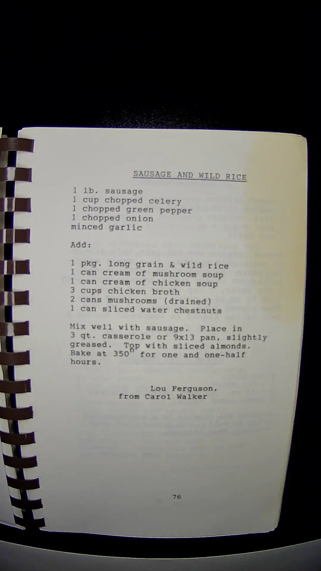 Here's the text from the image: **SAUSAGE AND WILD RICE** 1 lb. sausage 1 cup chopped celery 1 chopped green pepper 1 chopped onion minced garlic **Add:** 1 pkg. long grain & wild rice 1 can cream of mushroom soup 1 can cream of chicken soup 3 cups chicken broth 2 cans mushrooms (drained) 1 can sliced water chestnuts Mix well with sausage. Place in 3 qt. casserole or 9x13 pan, slightly greased. Top with sliced almonds. Bake at 350° for one and one-half hours. Lou Ferguson, from Carol Walker **76**llm